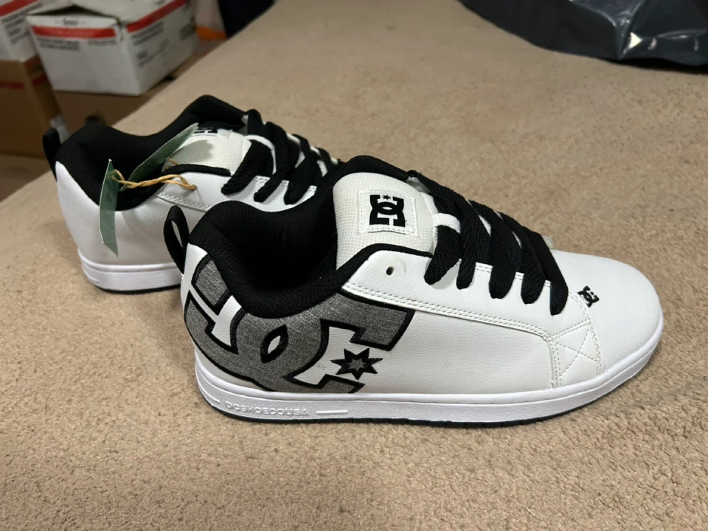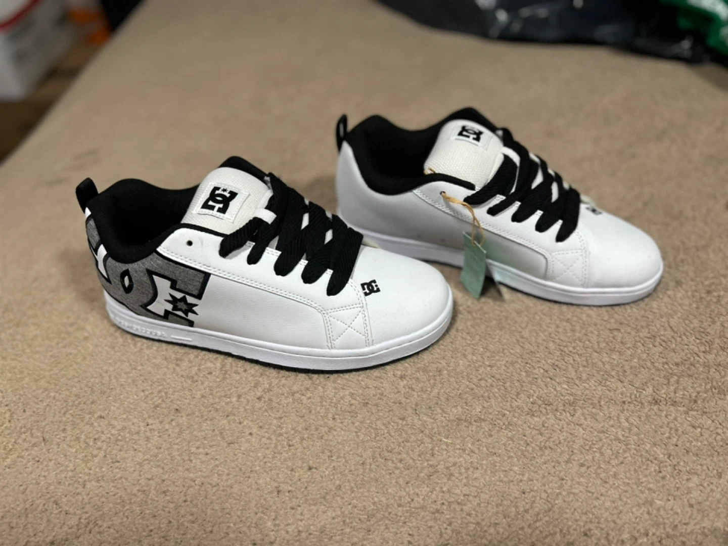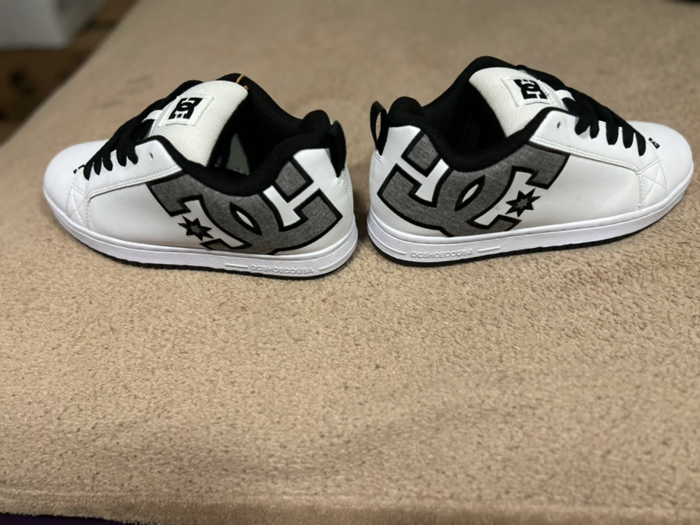 Selling a pair of DC skate shoes in white and grey. They feature the classic DC logo and design. Great for skating or casual wear!