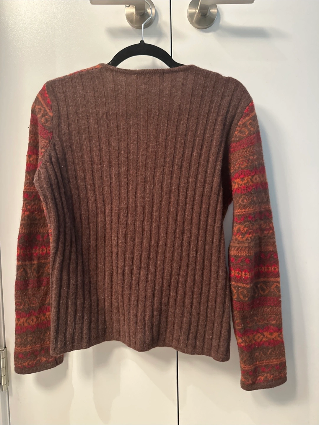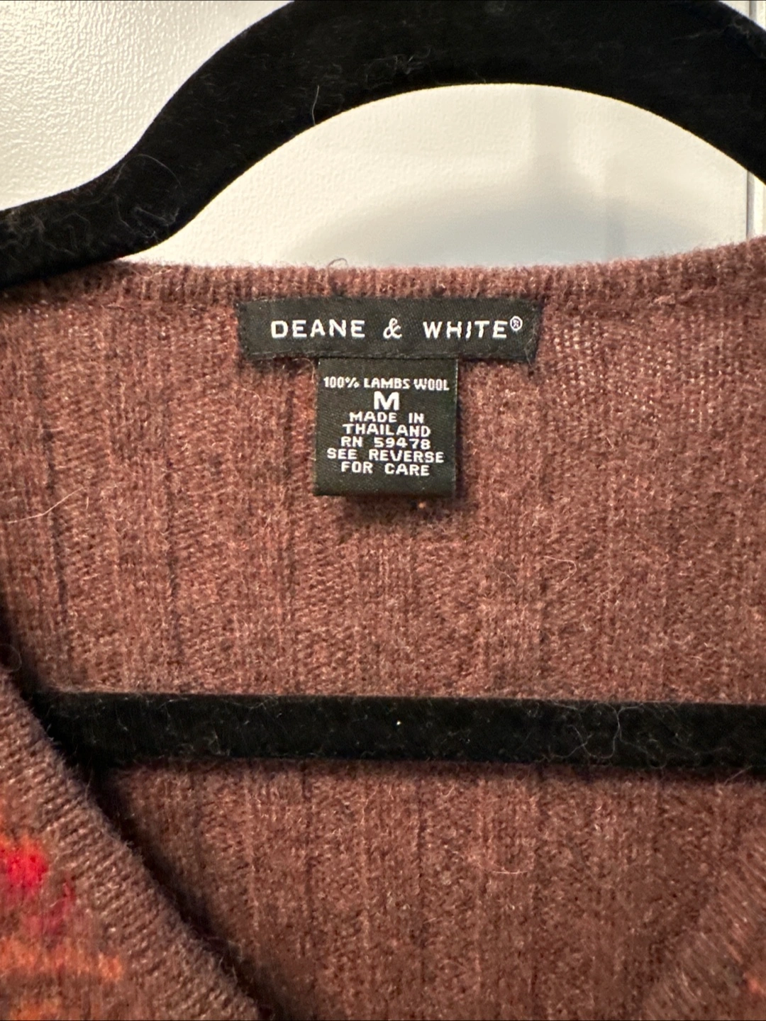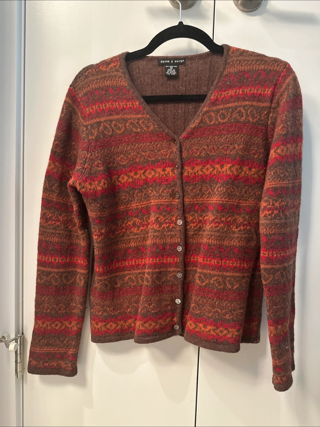 Cozy up in this Deane & White cardigan! It's made of 100% lambswool and is a size M. The warm brown and red tones make it perfect for fall and winter. It's in great condition and ready for a new home! Check my other listing