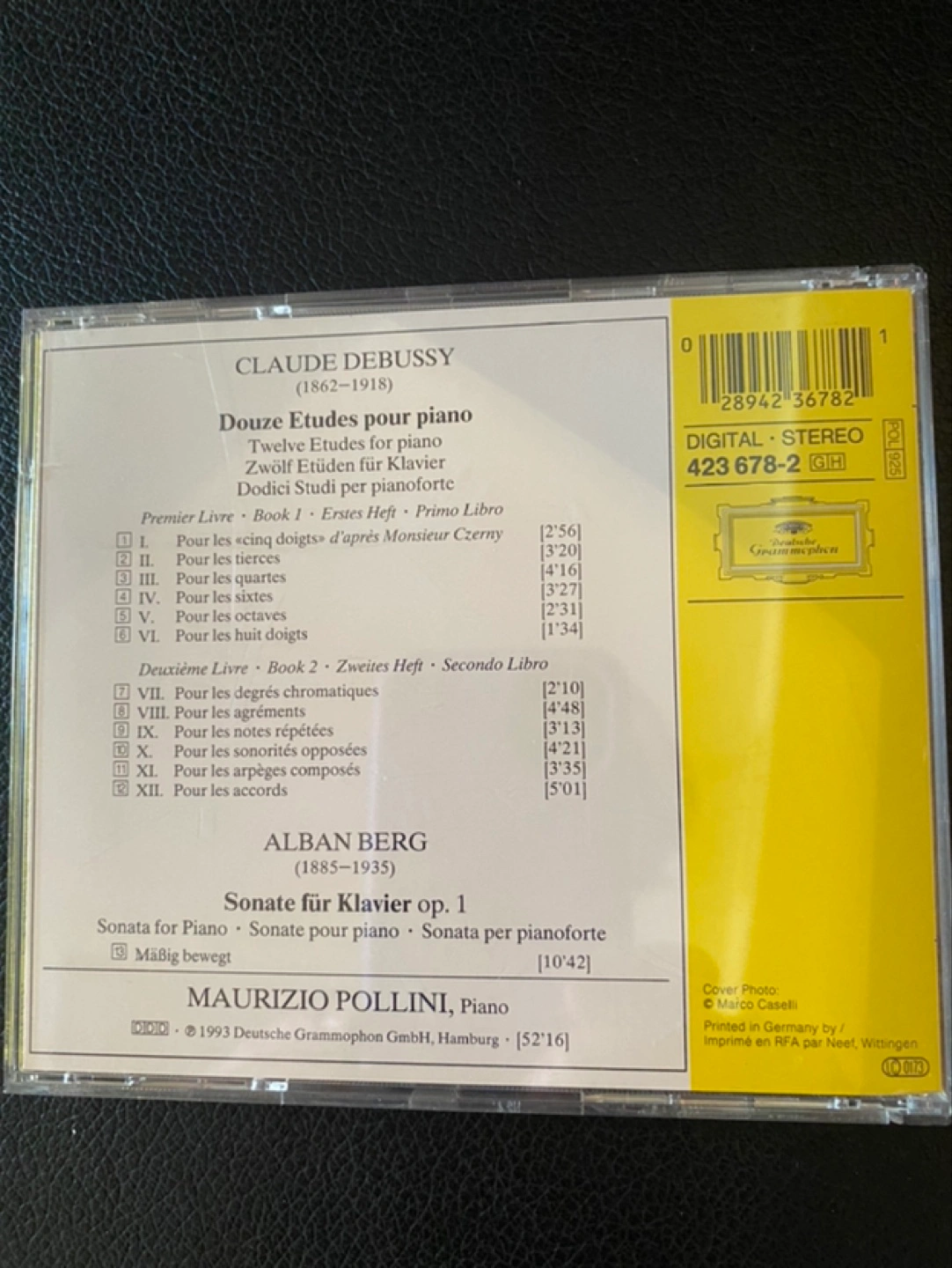 This CD features Debussy's 12 Etudes and Alban Berg's Sonate Op. 1. It is performed by Maurizio Pollini. From a pet and home free home. Pickup only in the St. Lawrence market area of downtown Toronto. Cash only. Check out my other CDs.