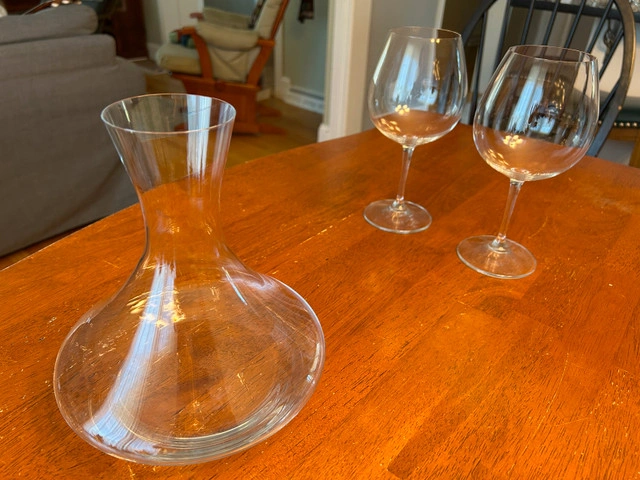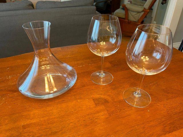 Decanter and 2 red wine glasses, in perfect condition. $15