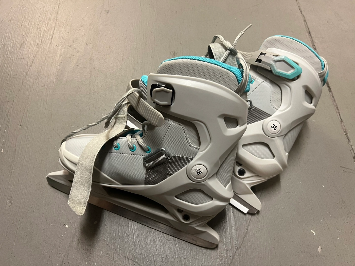 Pair of gray figure skates with teal accents. Size 38. Adjustable straps and laces. Good used condition. Only used for a winter.