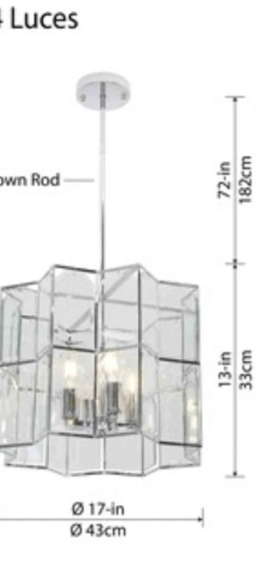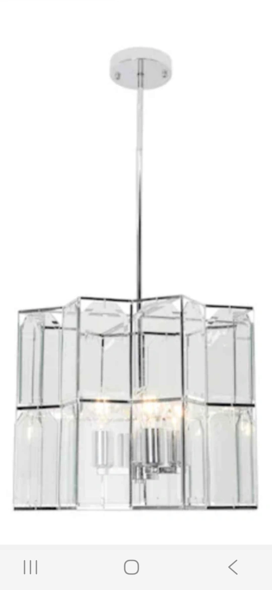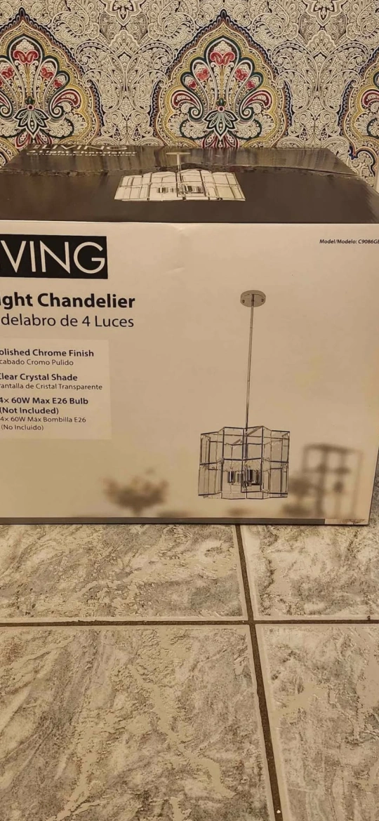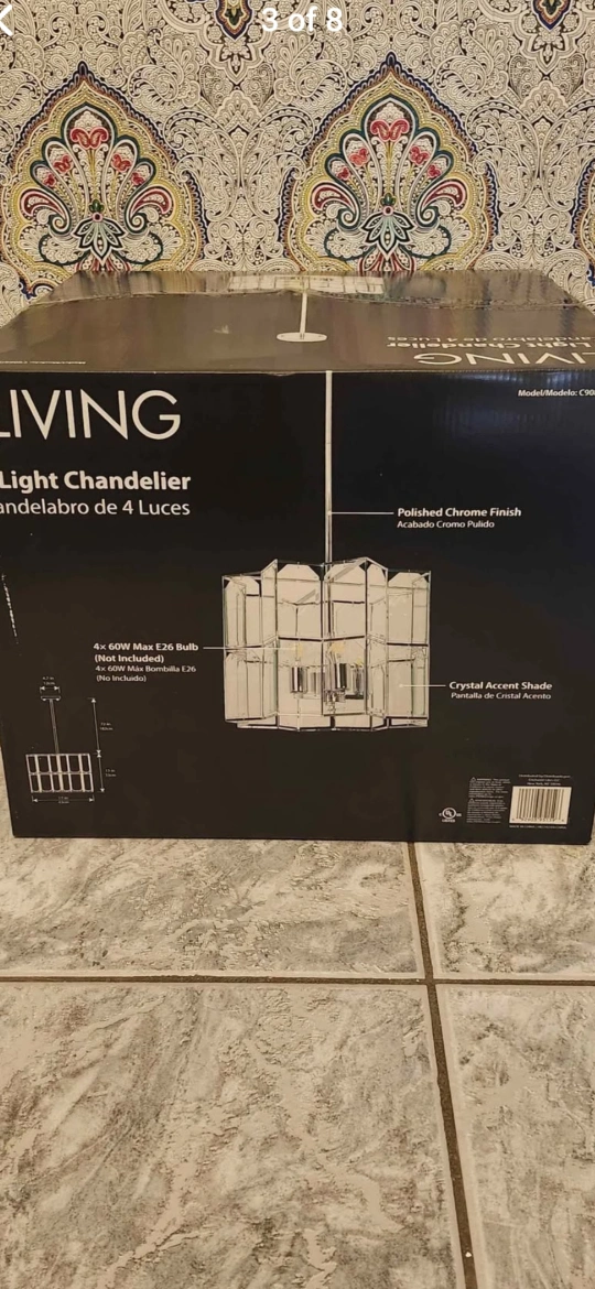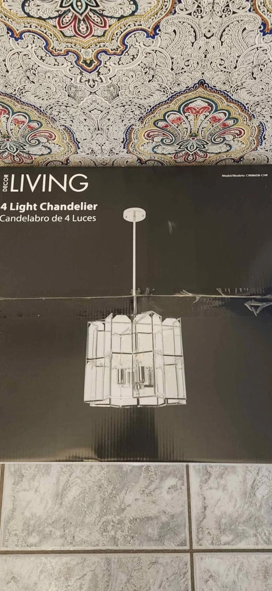 Selling a DECOR LIVING 4 Light Chandelier in box.. It features a polished chrome finish and a crystal accent shade. Requires 4 x 60W Max E26 bulbs (not included). Model number is C9086GB CHR.