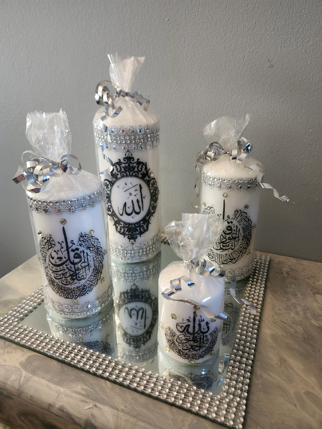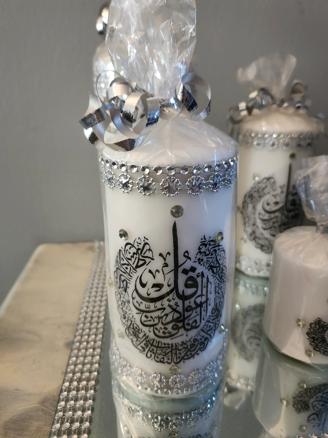 Beautifully decorated candles, perfect for adding a touch of elegance to any space. Each candle features intricate Islamic calligraphy and is adorned with sparkling rhinestones. They come wrapped with a silver ribbon, making them ideal for gifting or personal use
