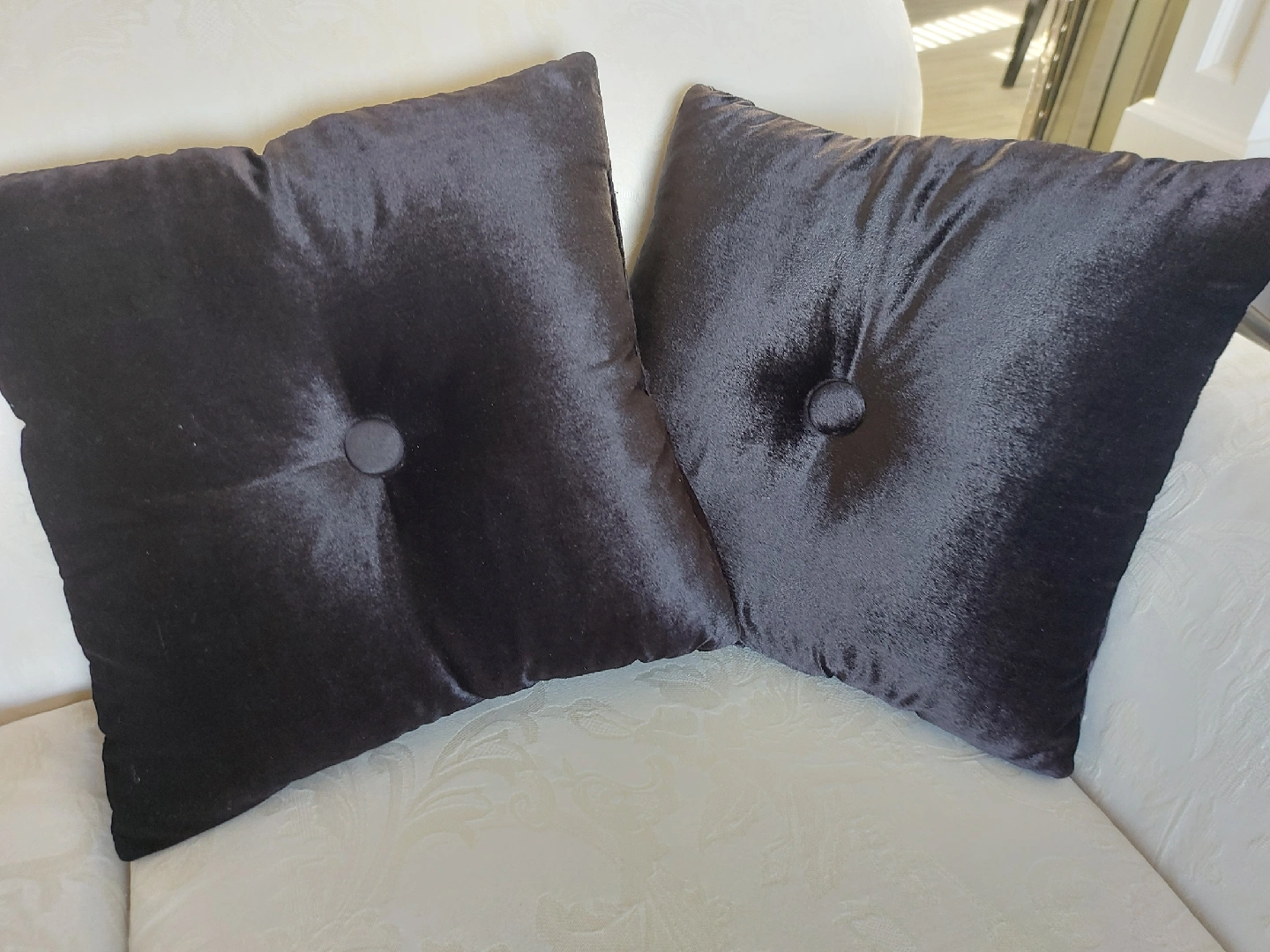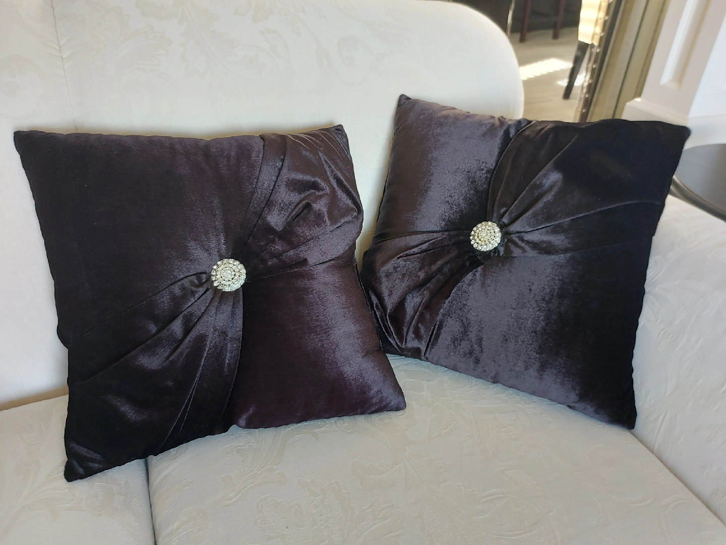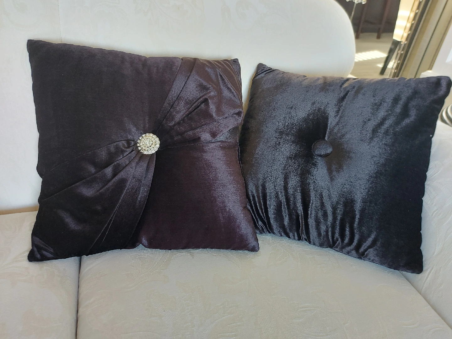 Selling a set of two decorative pillows! They're made of a soft black velvet material and would look great on a couch or bed. each pillow has a jeweled embellishment on one side and a velvet button detail on the other. They're in great condition and ready for a new home