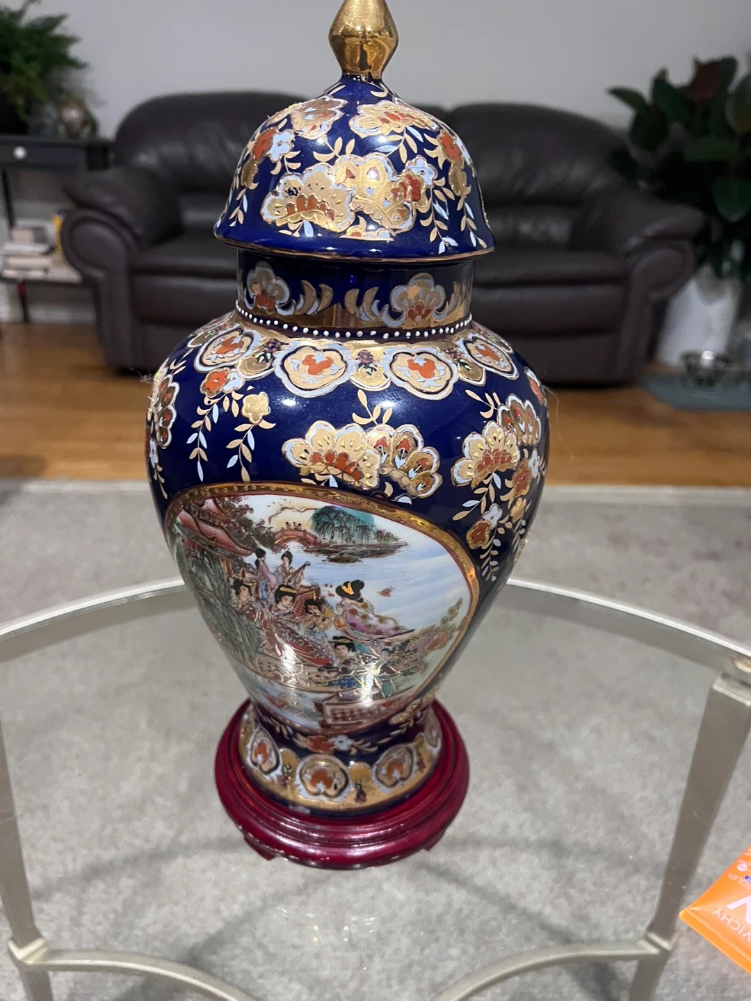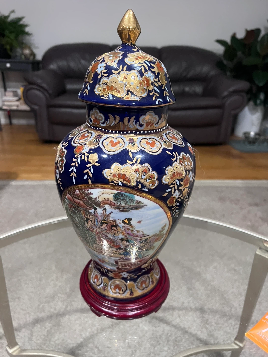 I'm selling a beautiful decorative vase! It's a ceramic piece with a lid, featuring a vibrant blue colour and intricate floral and scenic designs. It sits on a dark red wooden base. It would look great as a decorative piece in any home