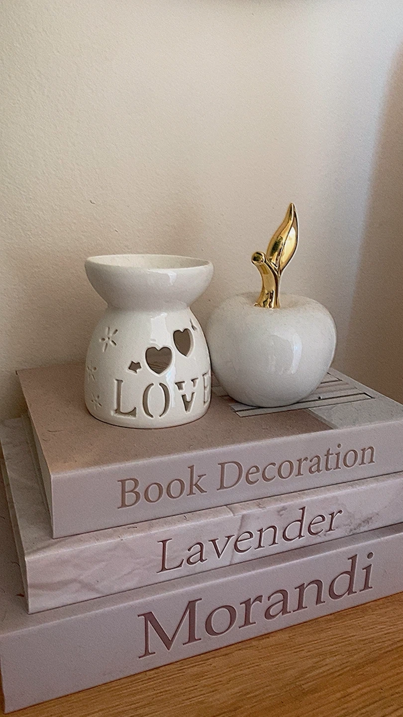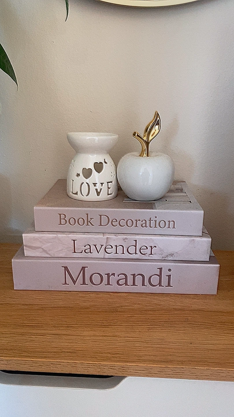 Selling a set of three decorative books. The titles are 'Book Decoration', 'Lavender', and 'Morandi'. They're perfect for adding a touch of style to your shelves or coffee table it also come with the candle holder and the apple