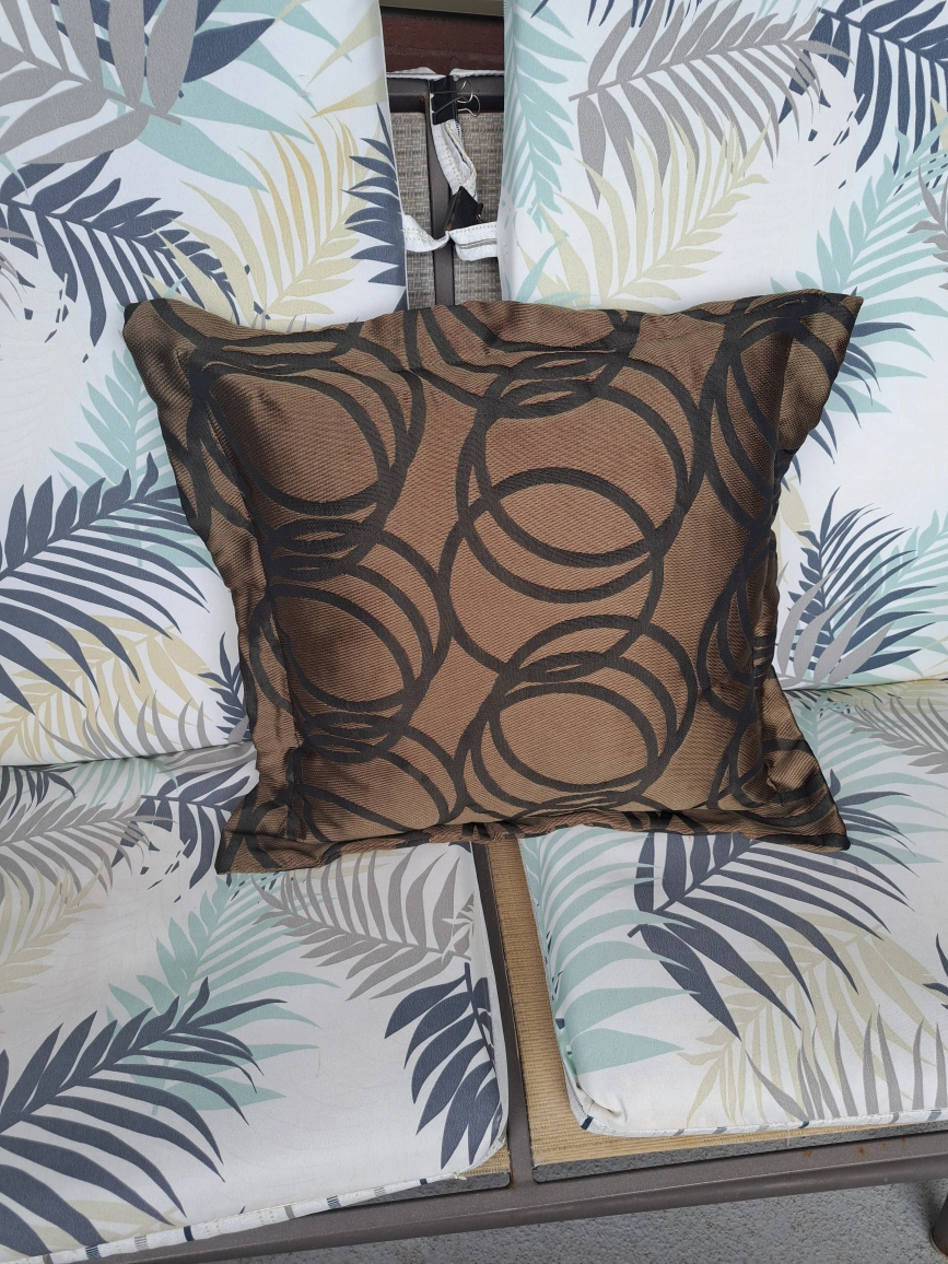 A square pillow. Features a brown background. Contains large black circle shapes. Throw it on the couch and relax after a long day.