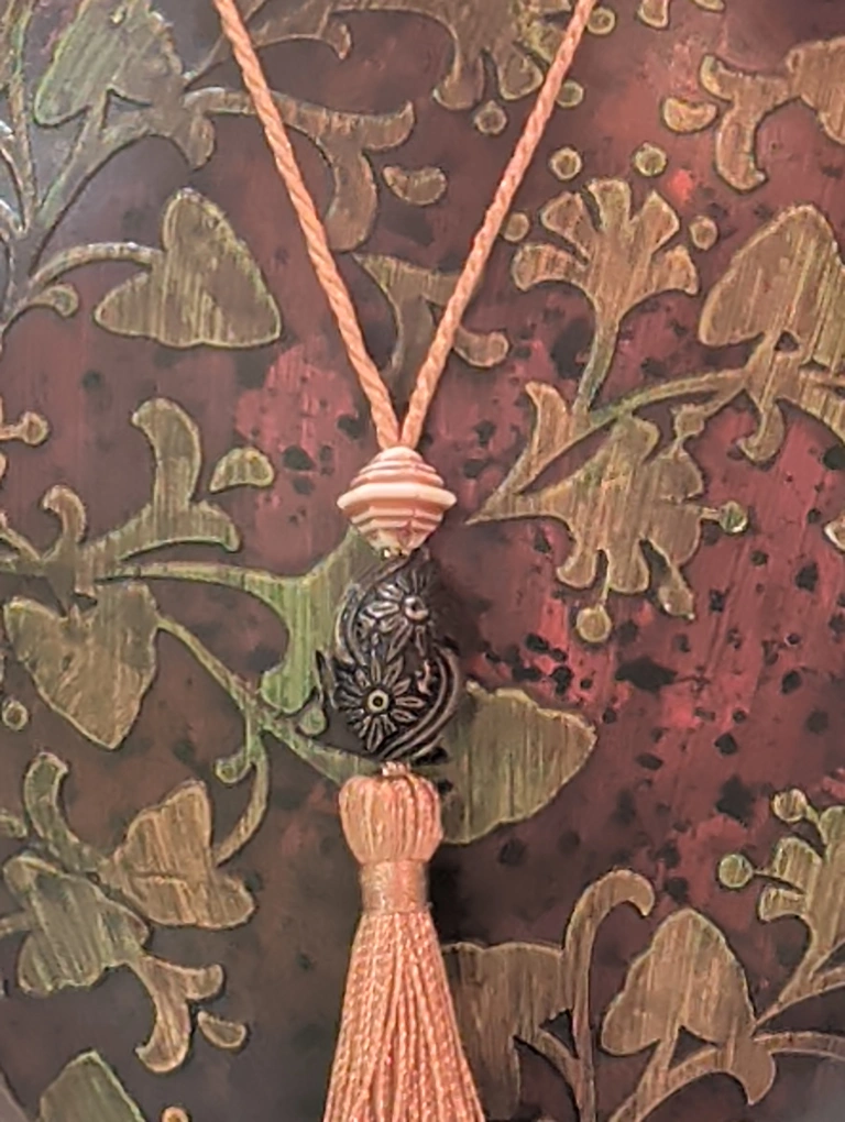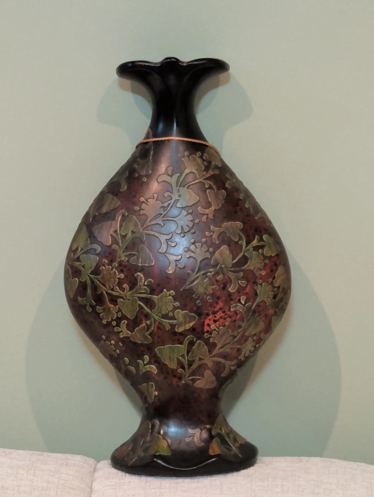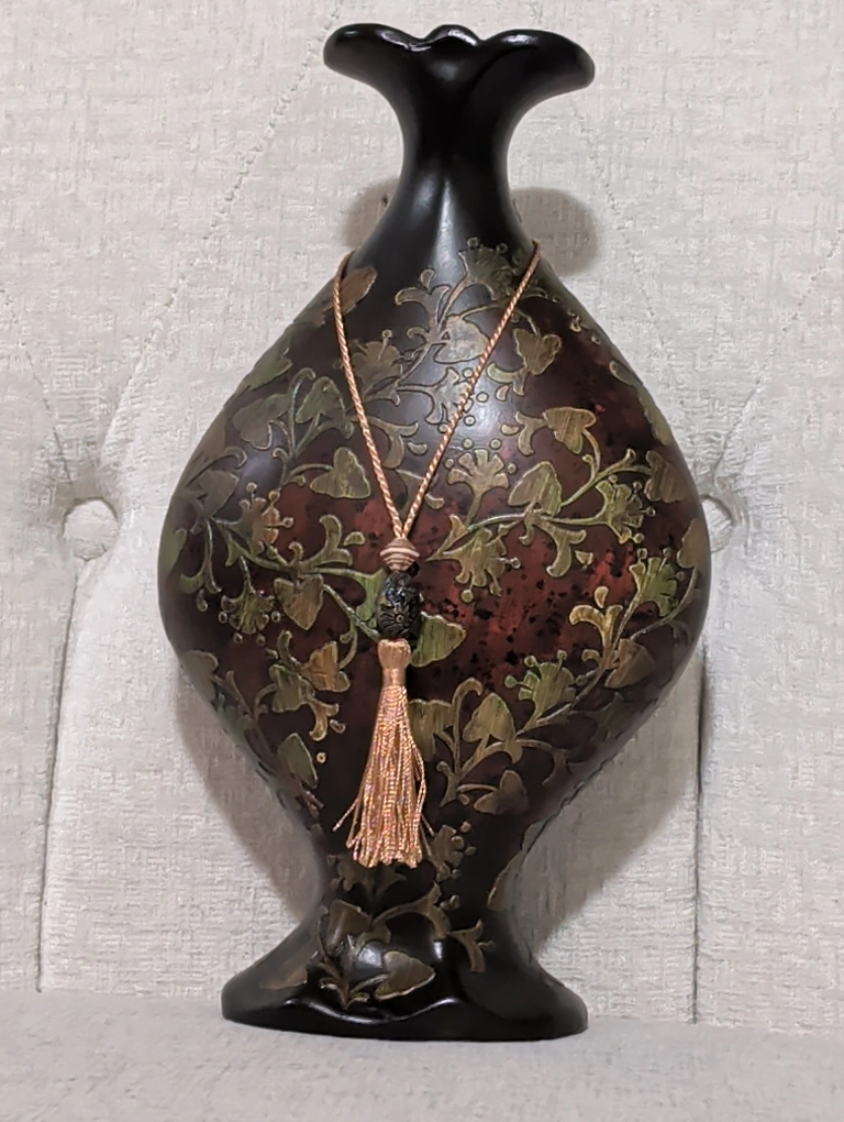 This is a lovely decorative vase with a unique floral design. It's in great condition and would look beautiful in any home. The vase features brown and green tones with a tassel accent.