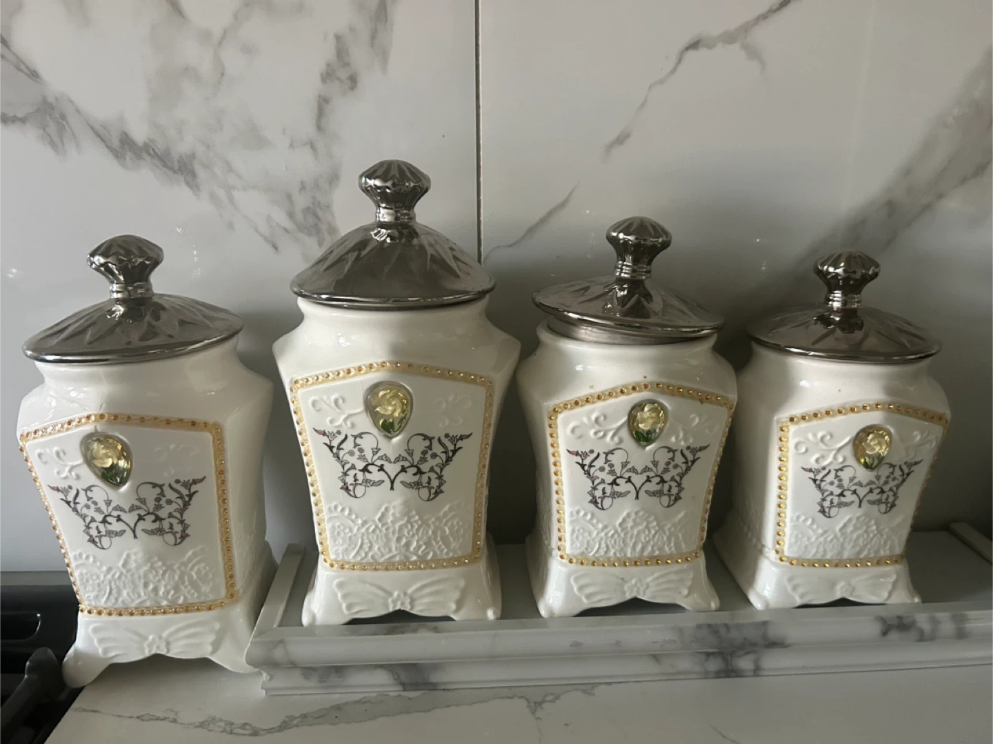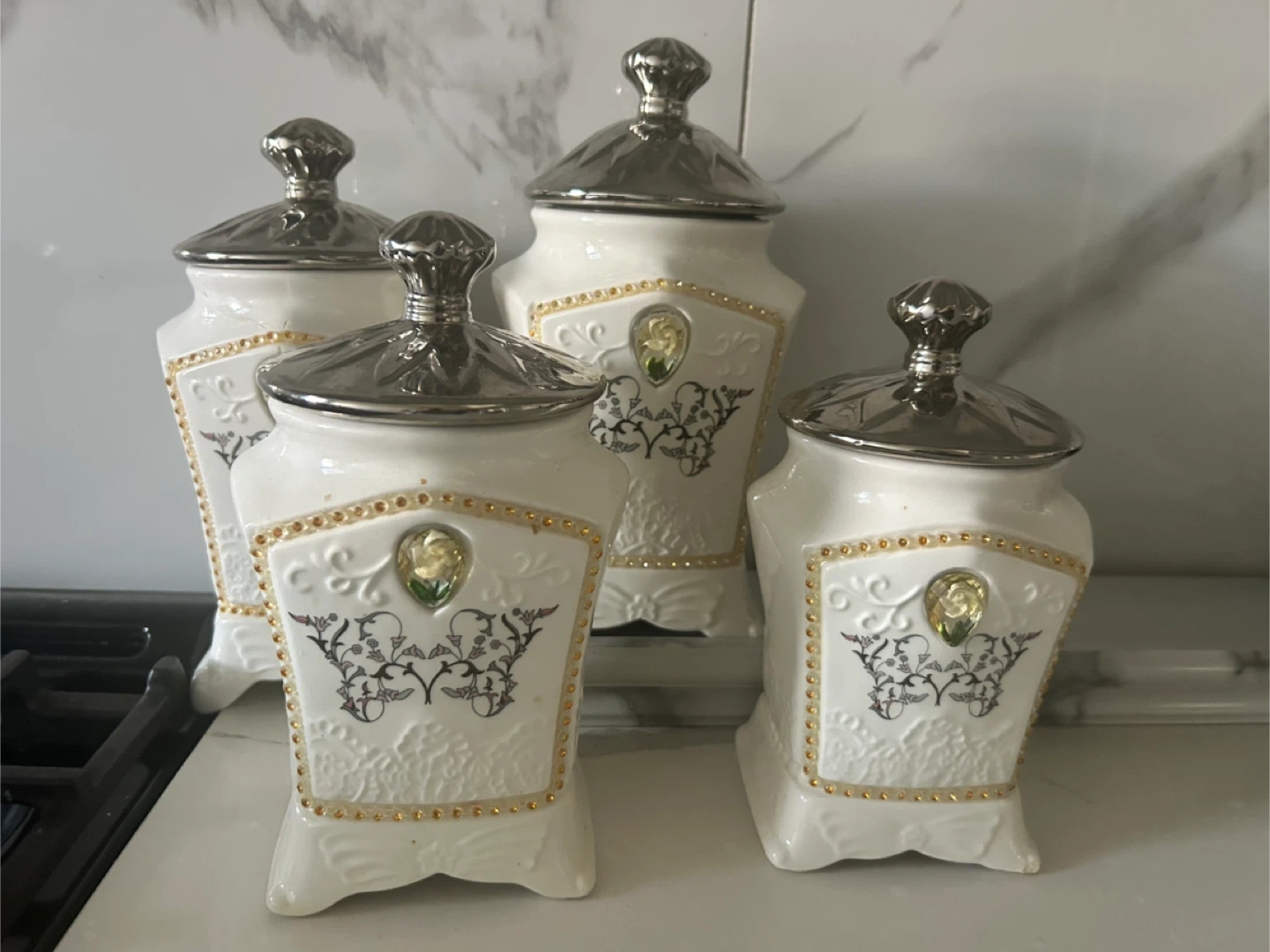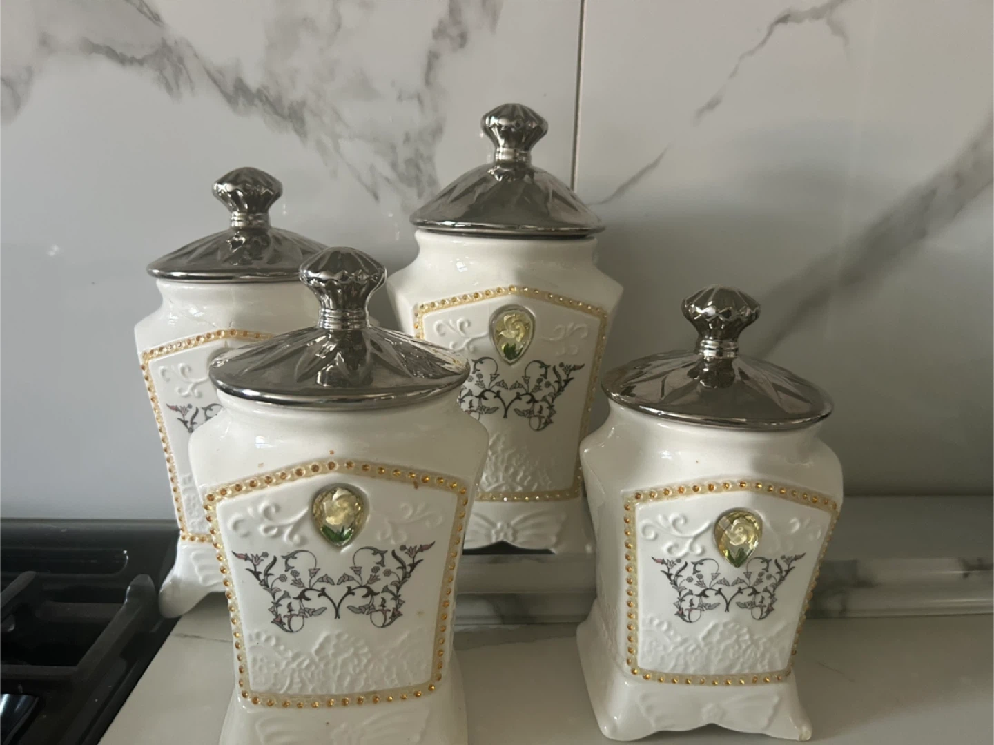 Selling a beautiful set of four decorative ceramic canisters! They feature a lovely white and silver design, perfect for adding a touch of elegance to your kitchen or dining area. The canisters are in great condition and ready to find a new home