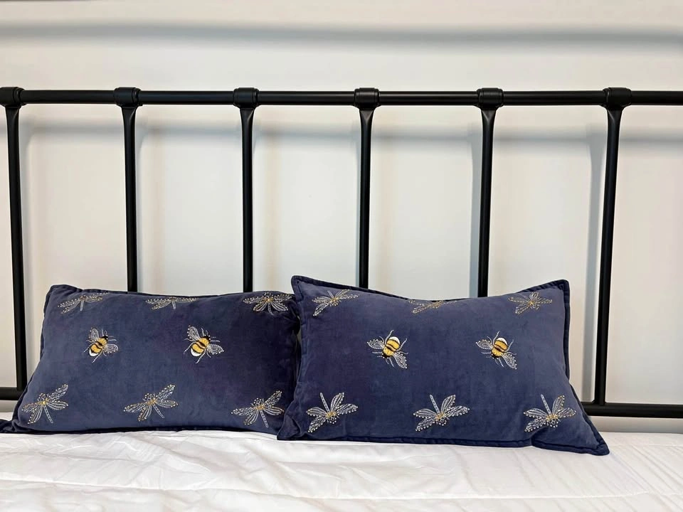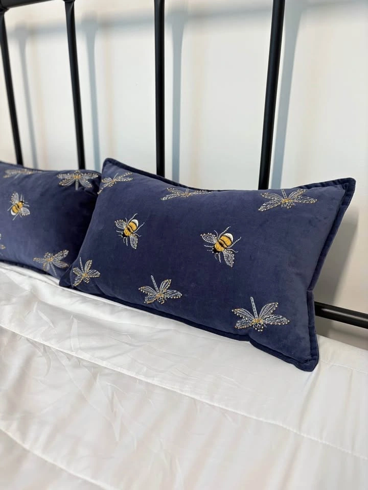 Add a touch of charm to your space with this beautiful set of 2 cushions. • Color: Deep navy blue • Design: Embroidered bees & dragonflies with gold accents • Size: Rectangular (approx. standard lumbar size) • Condition: Excellent, like new Perfect for sofa, bed, or accent chair. Cozy velvet feel with a stylish design that stands out.