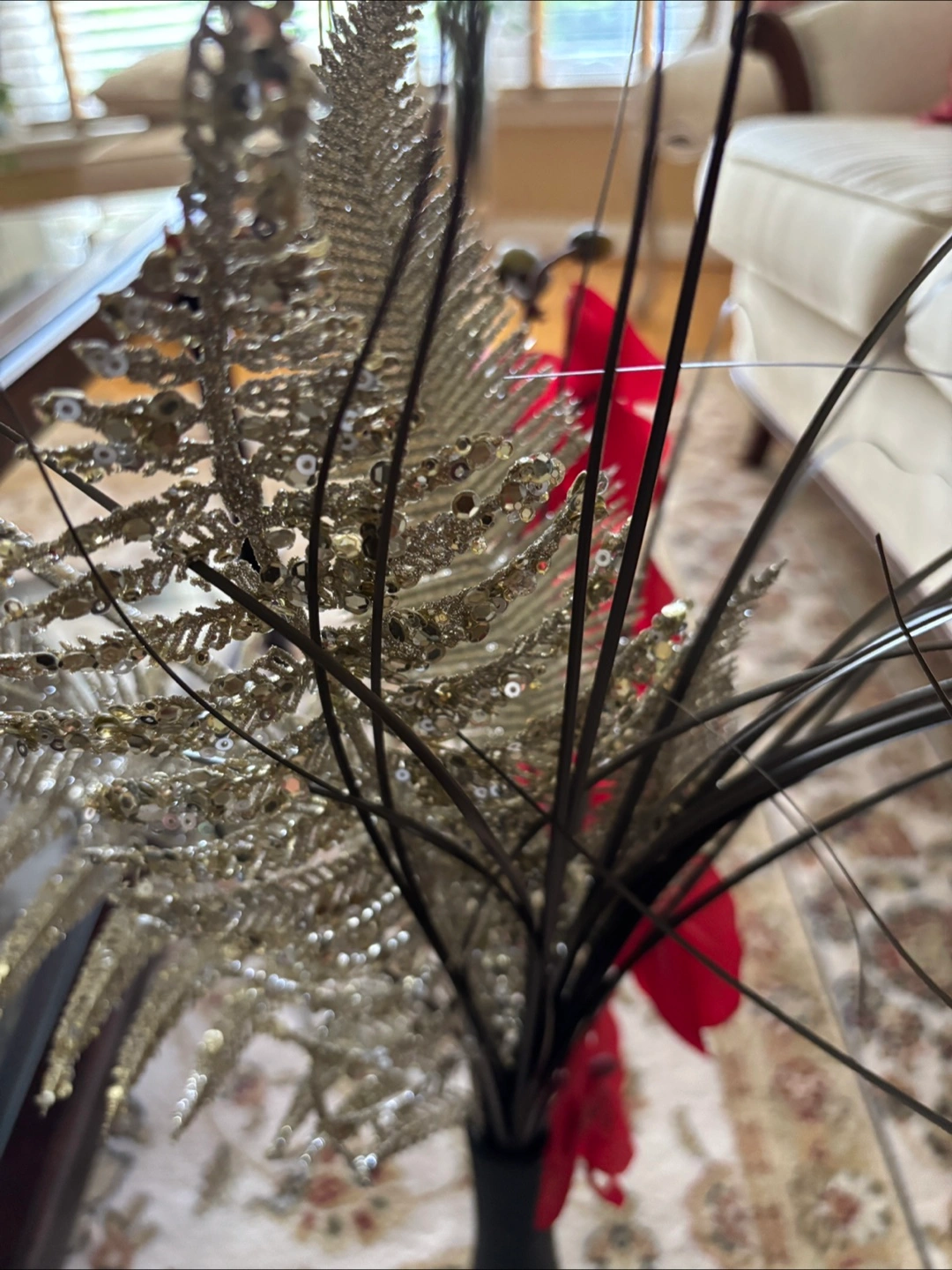 Set of 2 arrangements of artificial flowers and decorative elements. Each arrangement consists of a black vase, with silver and black elements and red blossoms. Such a lovely addition to brighten any room.