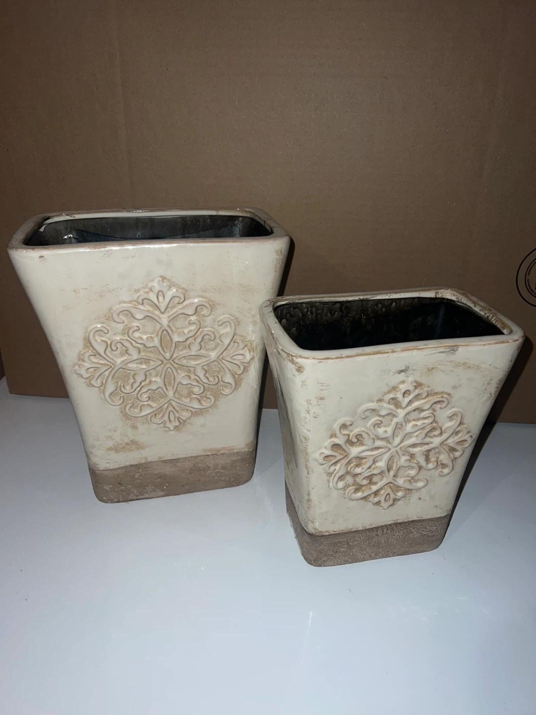 Selling a set of two decorative flower pots. They have a square shape with a unique floral design on the front. The pots are in great condition and would look lovely in any home!