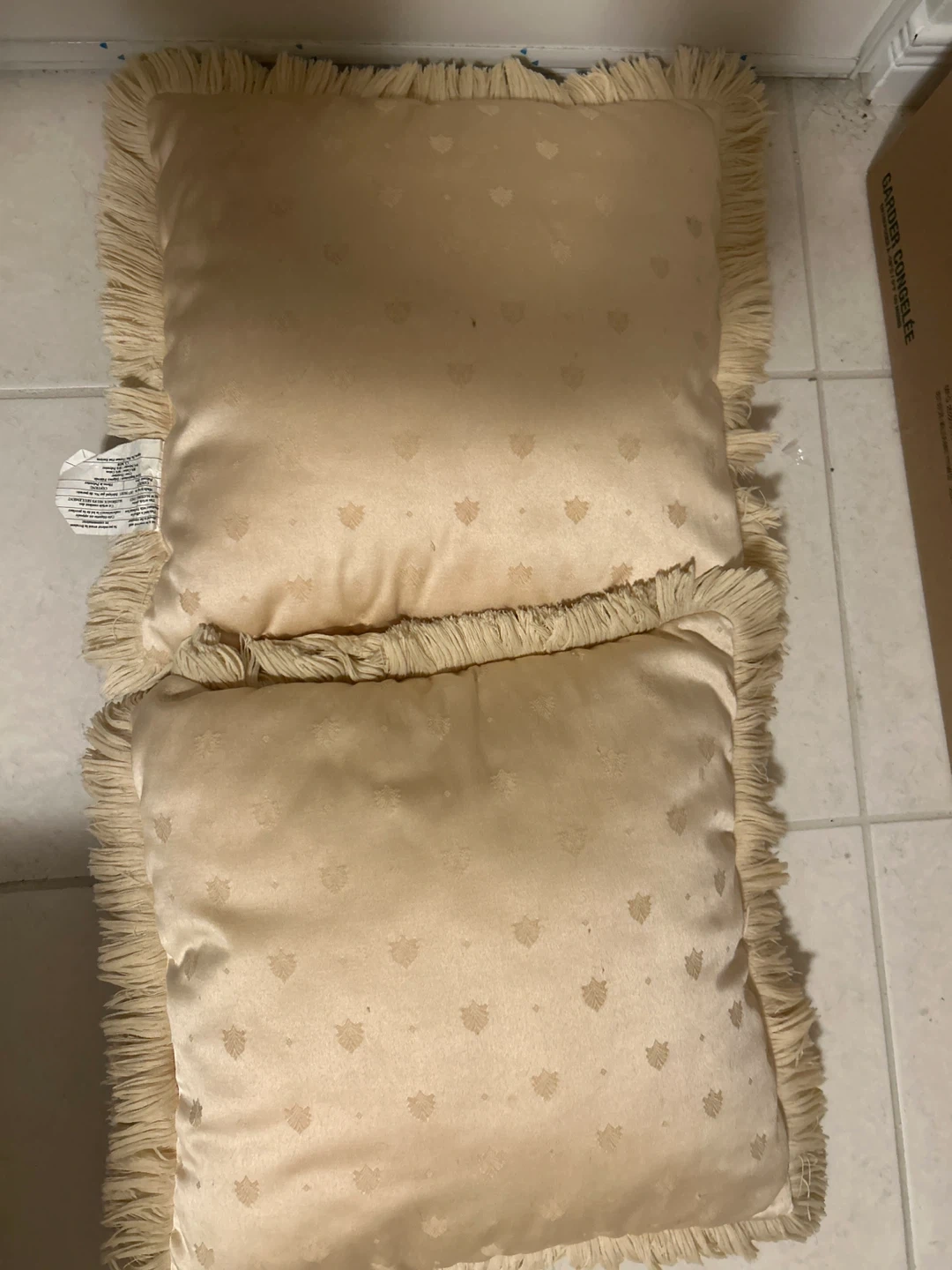 Selling a set of two decorative pillows. They have a nice fringe trim and a subtle pattern. Perfect for adding a touch of elegance to your living room or bedroom!