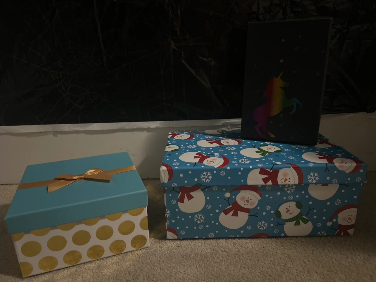 Selling a set of three decorative gift boxes! They come in different sizes and designs, perfect for storing small items or gifting purposes. The boxes feature a unicorn design, a snowman design, and a polka dot design. They are in great condition and ready for a new home! These are also awesome for using as a gift box! Looking to sell as a lot but willing to take individual offers!