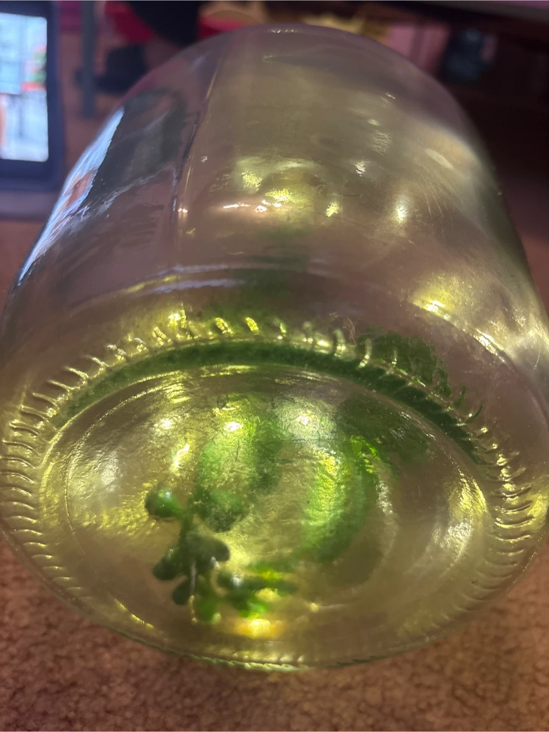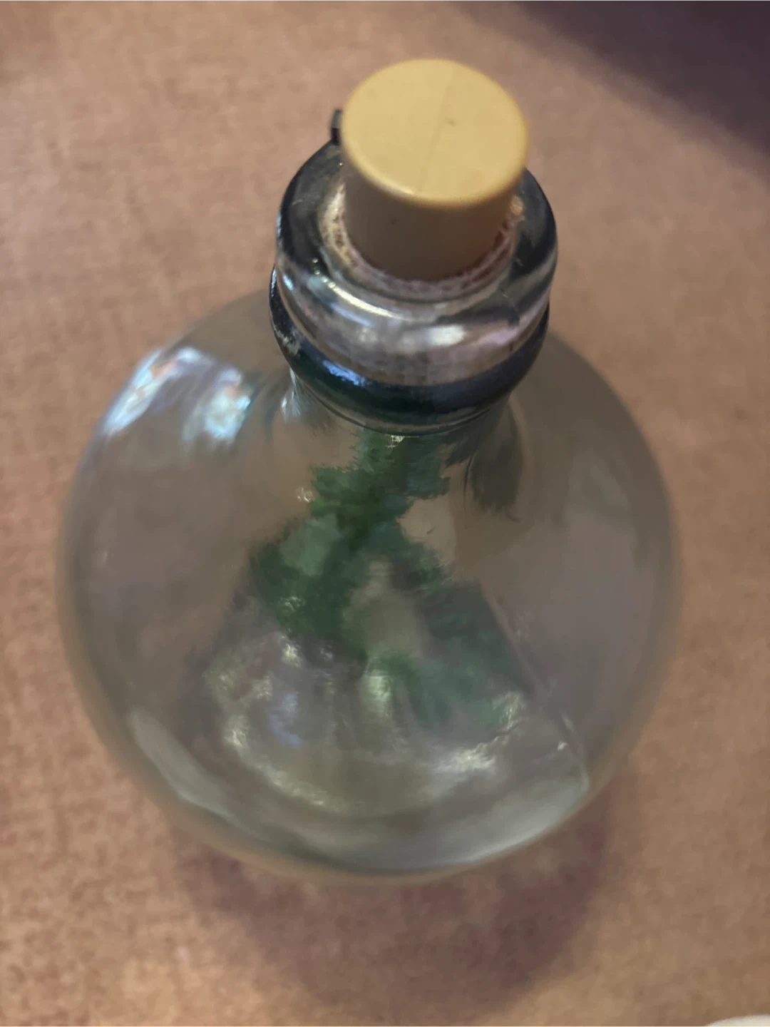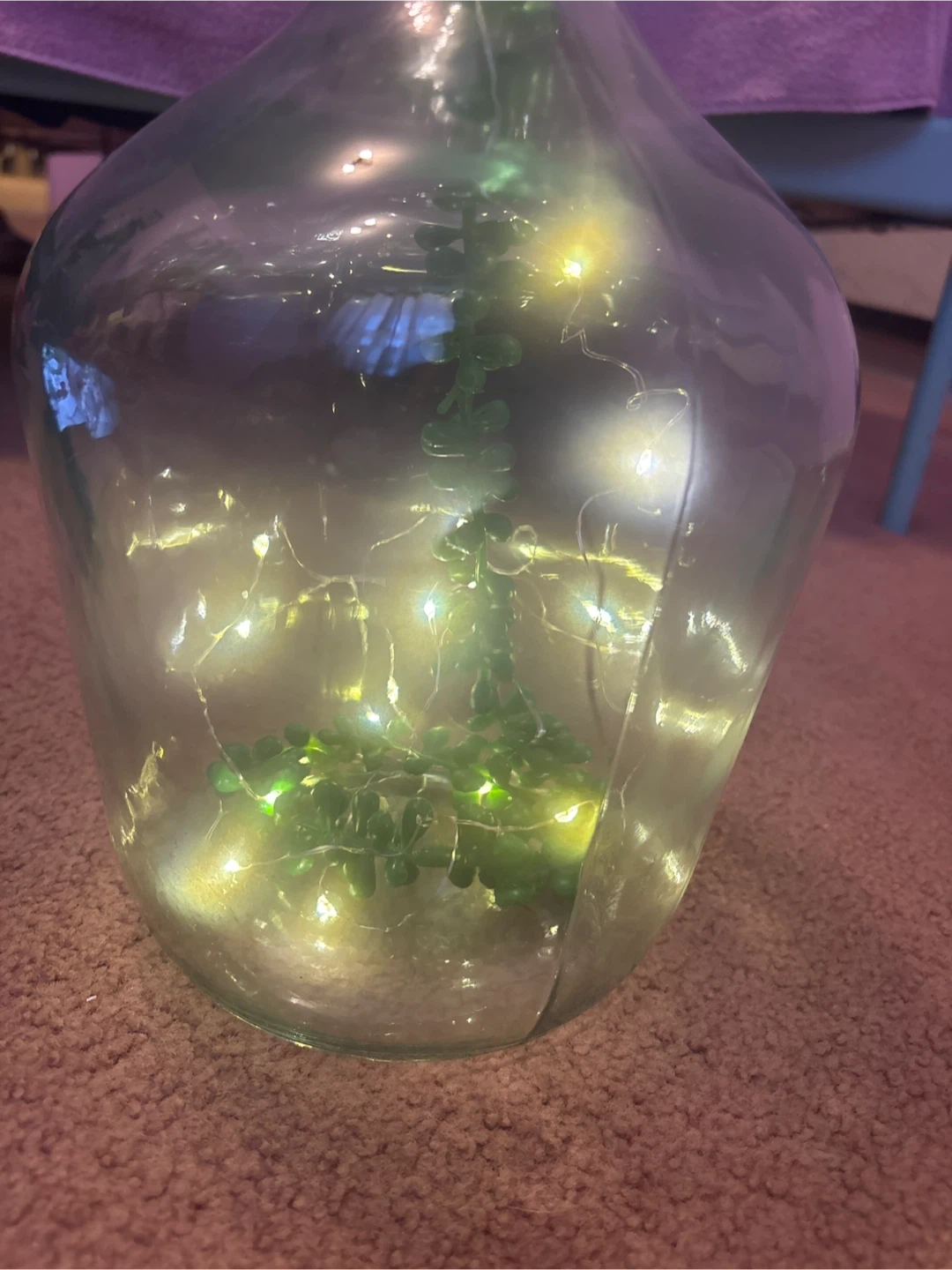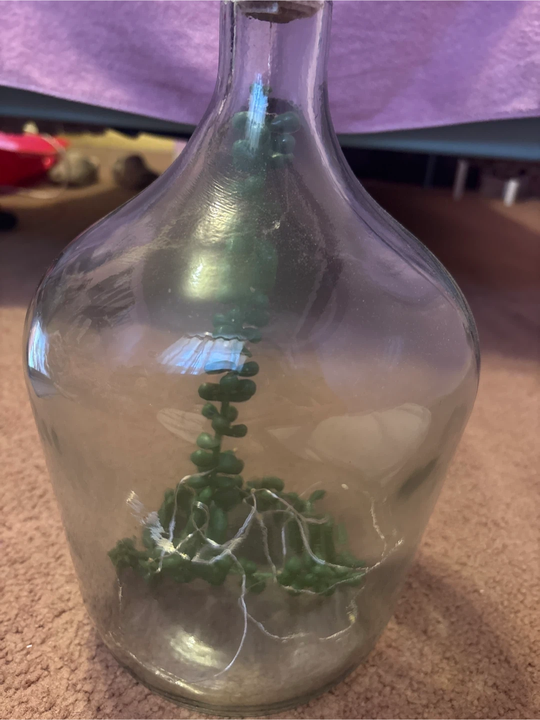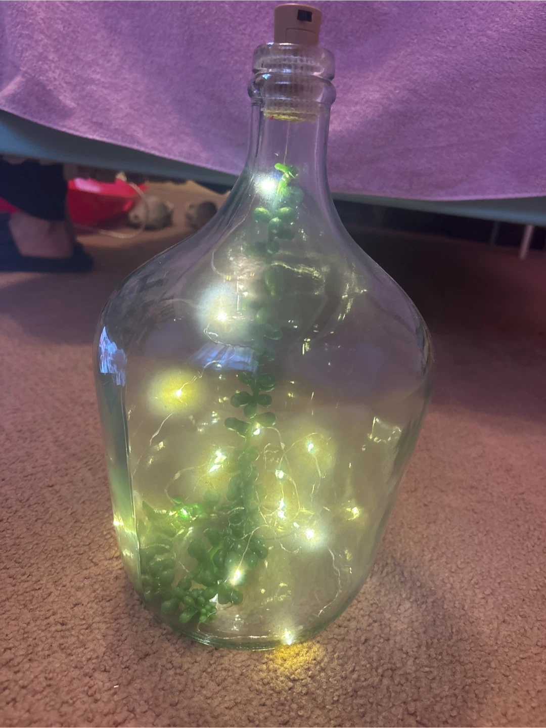 Clear glass bottle with a cork stopper, fairy lights, and a faux plant inside. It would look great as a decorative piece in any room! (I make all of these)