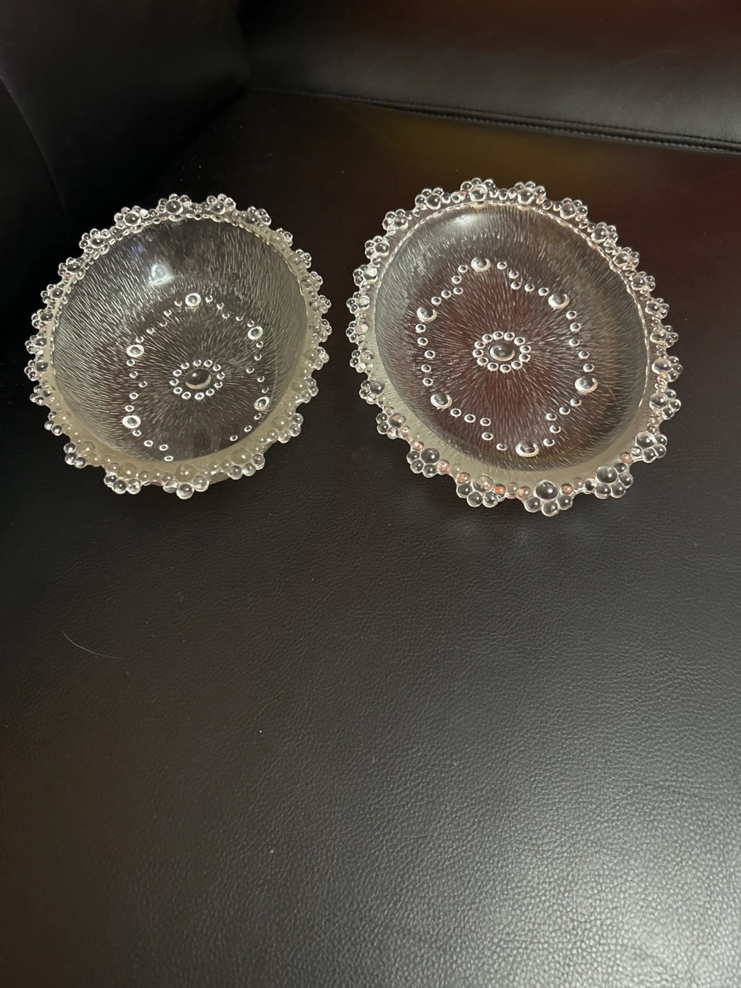 Selling a set of two decorative glass bowls! They feature a lovely textured design with a beaded edge. Perfect for adding a touch of elegance to your home decor or for serving small snacks.