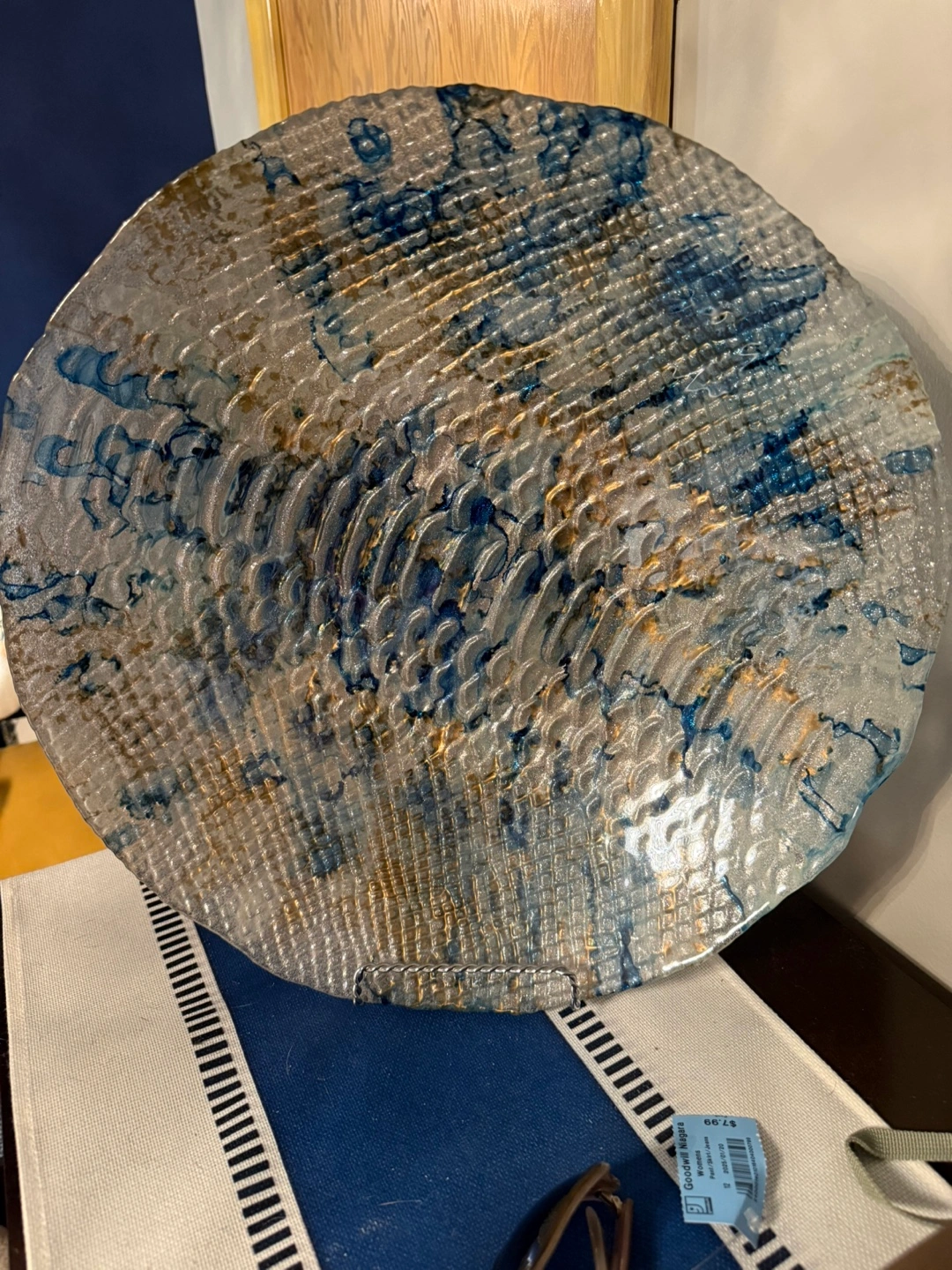 Selling a lovely decorative glass plate. It has a unique textured pattern with blue and gold accents. Would look great as a centrepiece or wall decor!