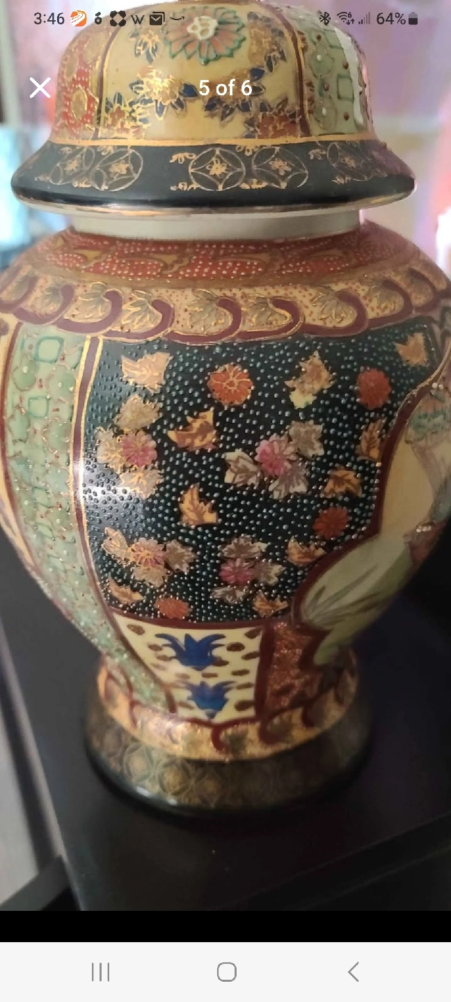 Beautiful decorative jar with lid. It features intricate floral and bird designs in a variety of colours. The bottom has a 'Made in China' 12 inches high