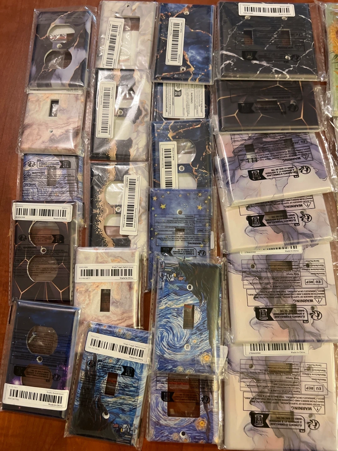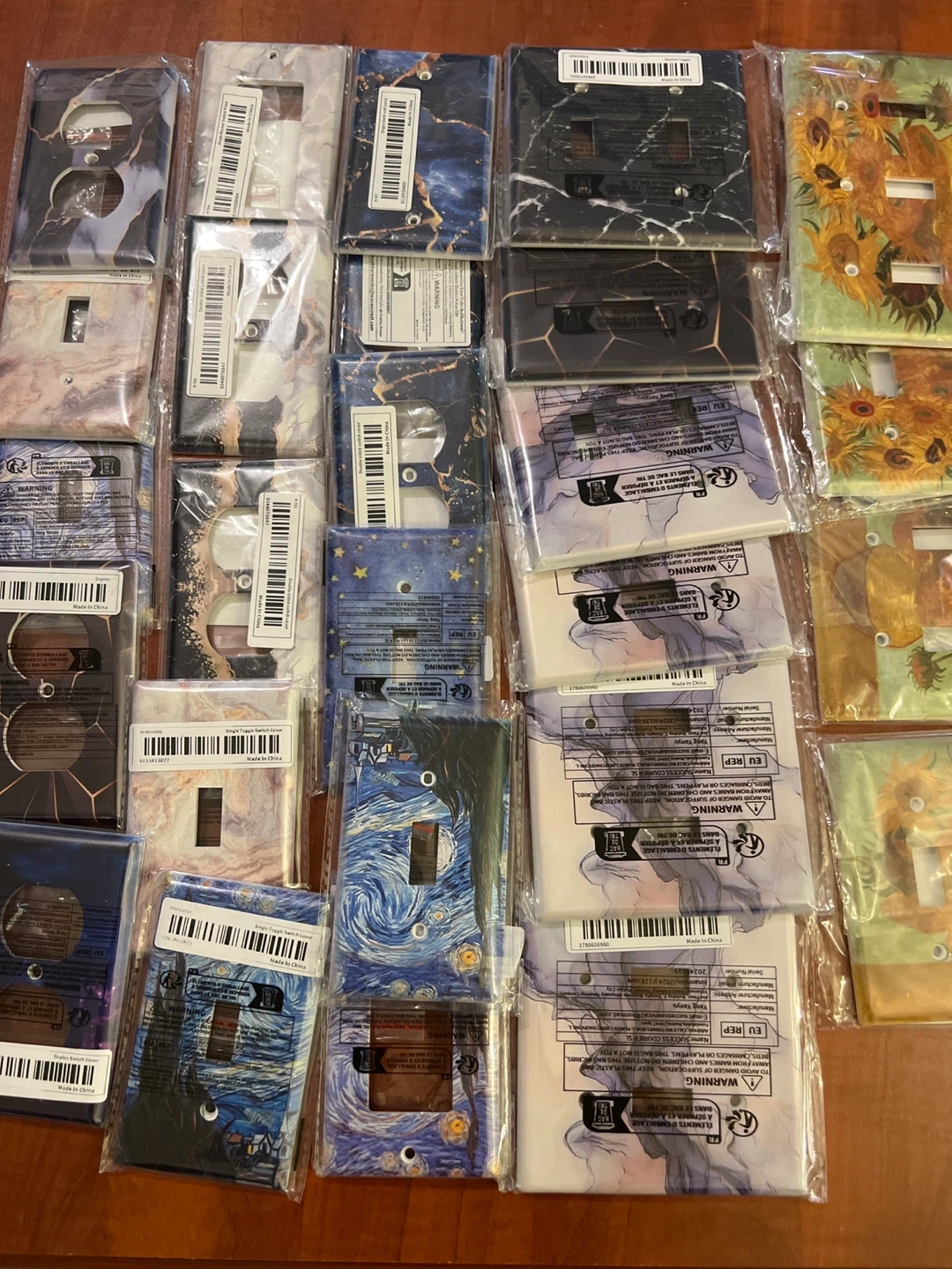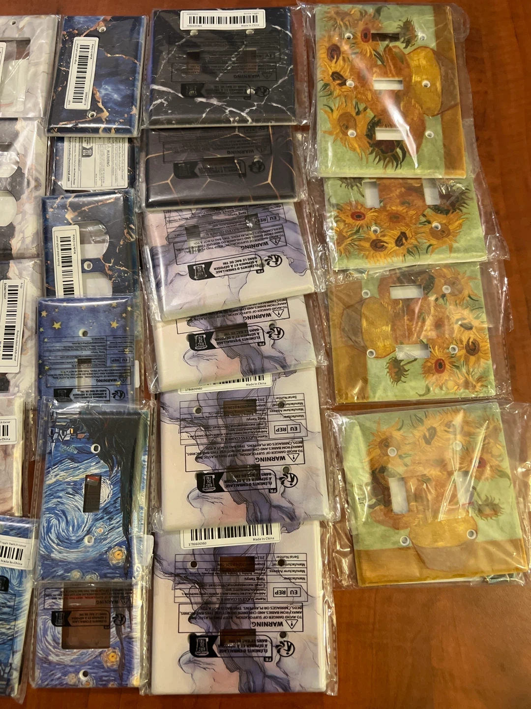 Selling a variety of 26 decorative light switch covers! They come in different designs, including marble patterns, starry nights, and sunflowers. Perfect for adding a unique touch to any room