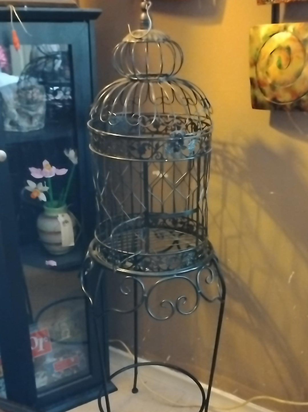 Selling a decorative metal bird cage with a stand. It's in great condition and would make a lovely addition to any room. The metal has a dark finish with some decorative swirls.