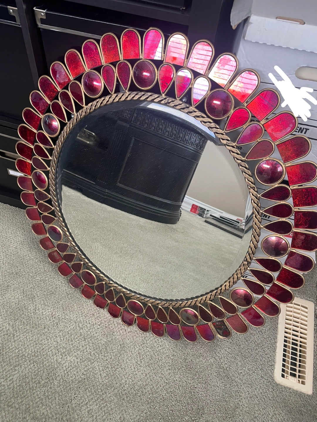 Round mirror with decorative red accents. Mirror has a gold-colored rope-like trim. Think about how nice it would look hanging in a living room.