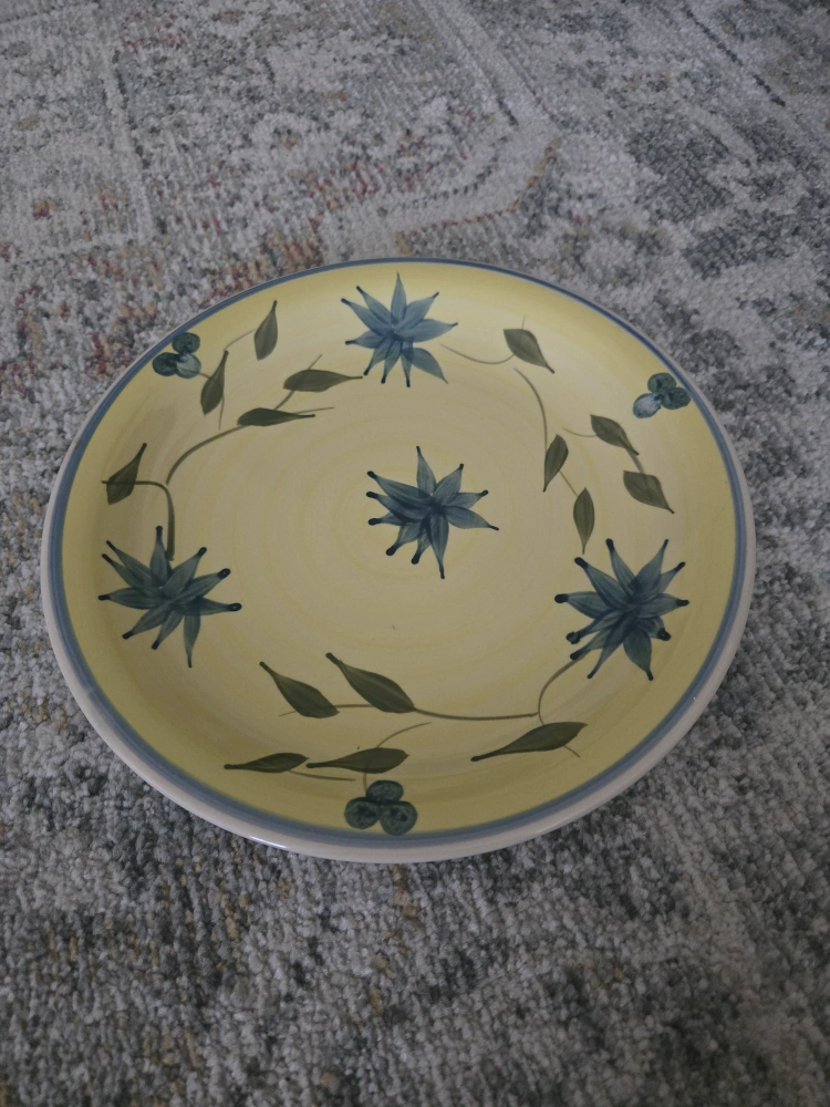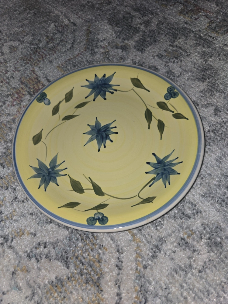 Selling a decorative plate featuring a lovely yellow background and a blue floral design. It would look great on a wall or as part of a table setting! It's in great condition and ready for a new home