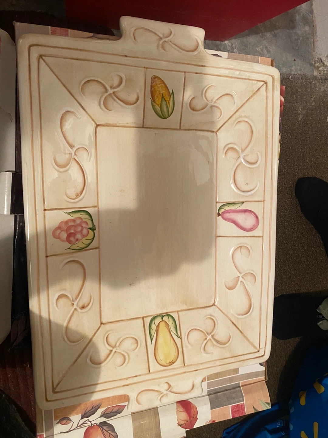 Selling a decorative serving bowl with a unique design featuring various fruits and vegetables around the rim. It's perfect for adding a touch of charm to your dining table or kitchen. The bowl is in good condition and ready for a new home!