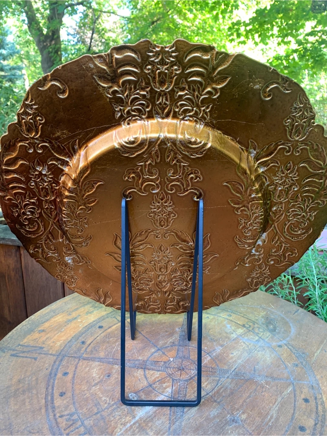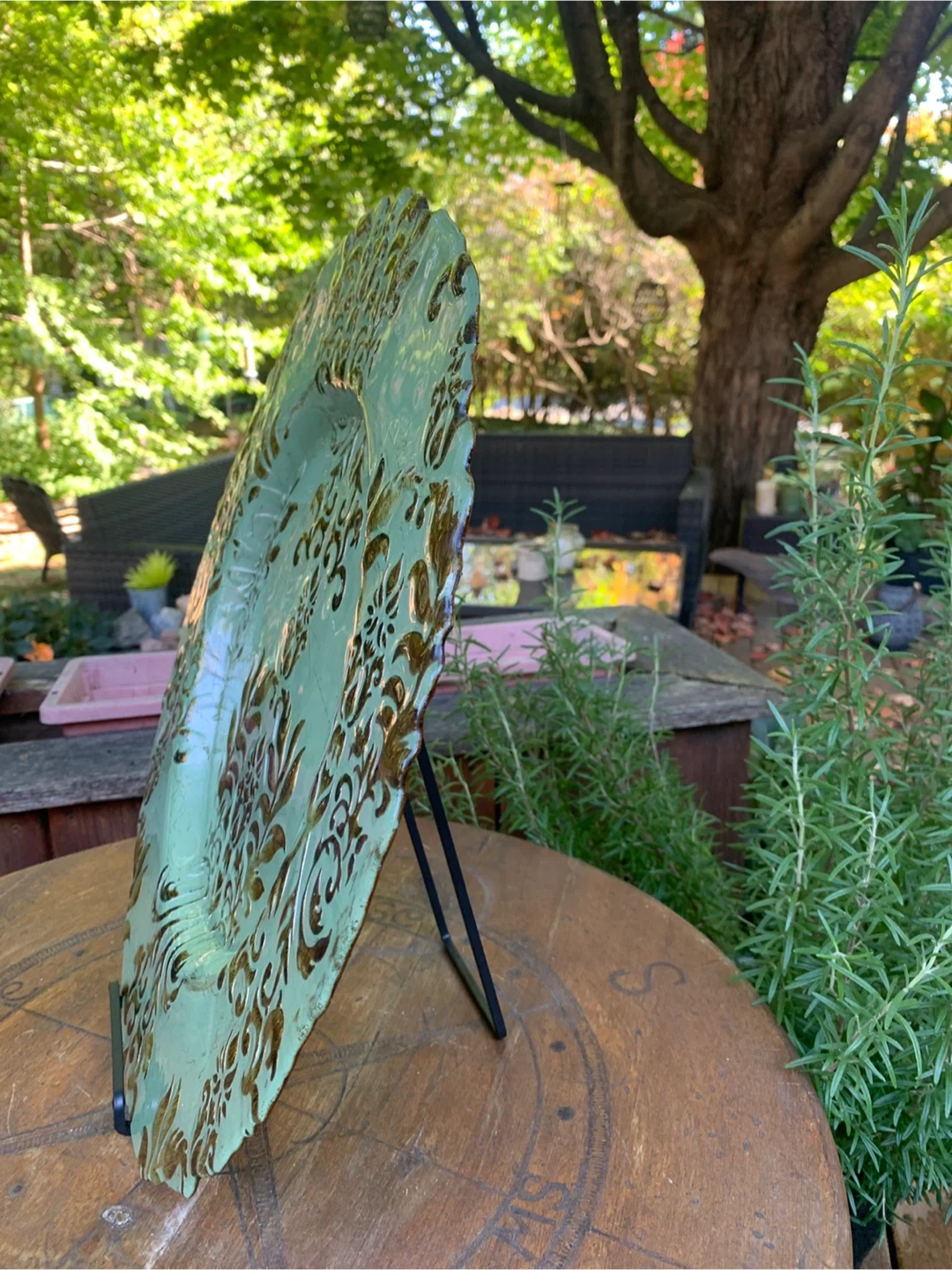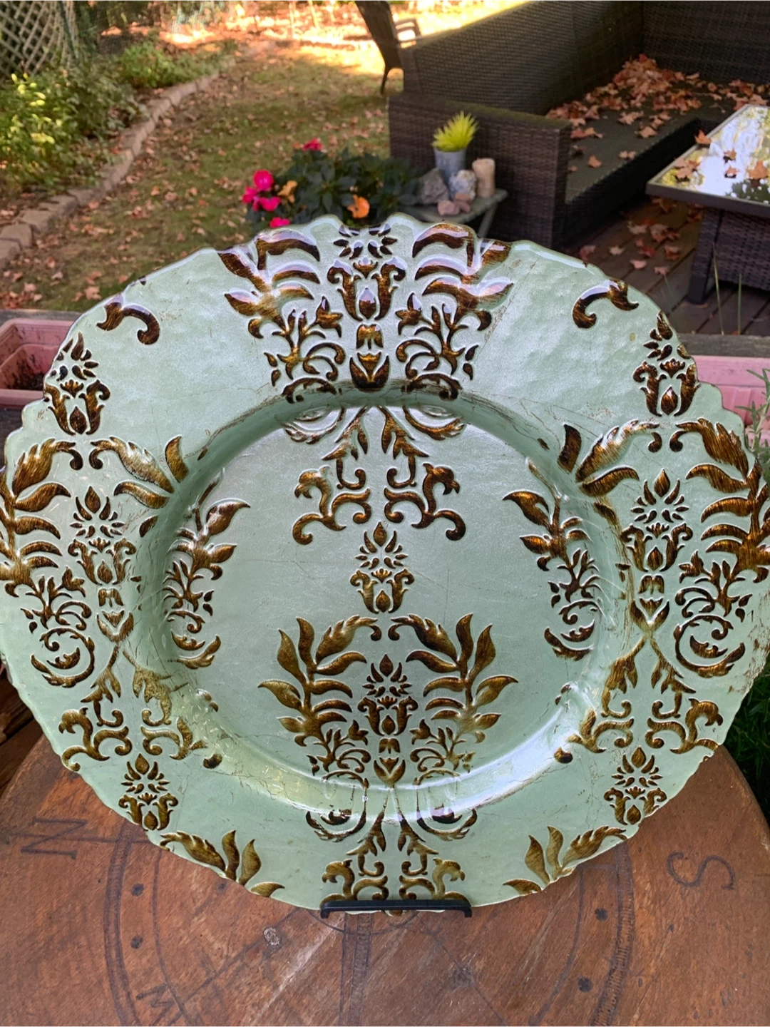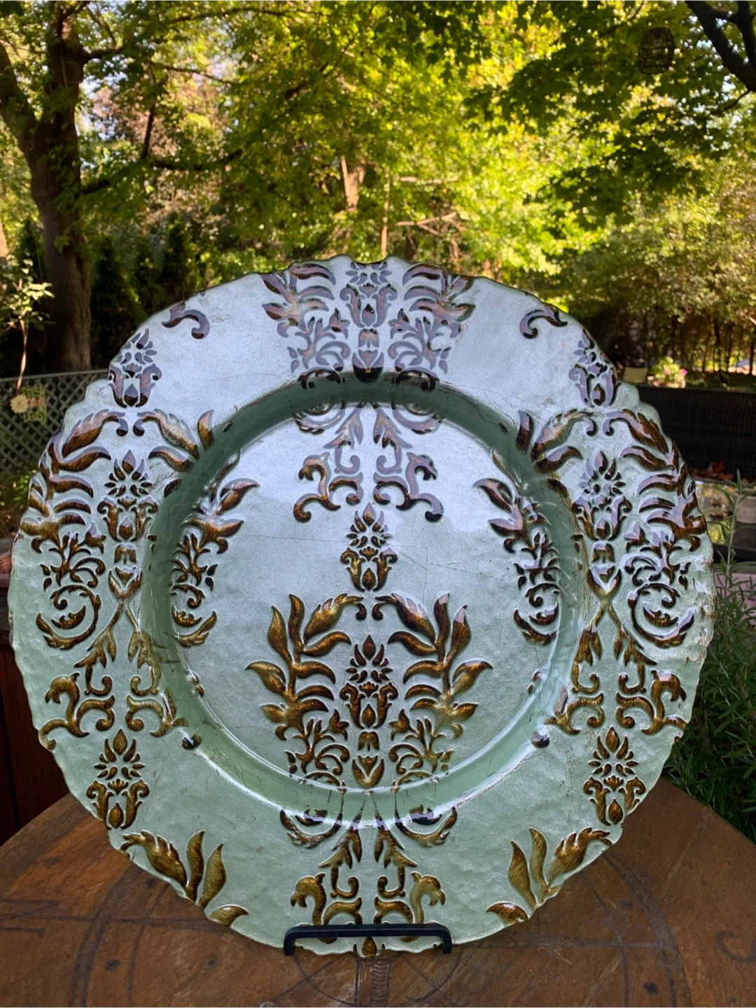 Here's a lovely glass decorative serving plate, perfect for adding a touch of elegance to your table setting or display! It features a beautiful green and ornate gold design. It's in good condition with just some light scratching noticeable and ready to find a new home! It is 18” in diameter. Would be nice on your fall or holiday tablescape! Cash only please. Plate stand not included.
