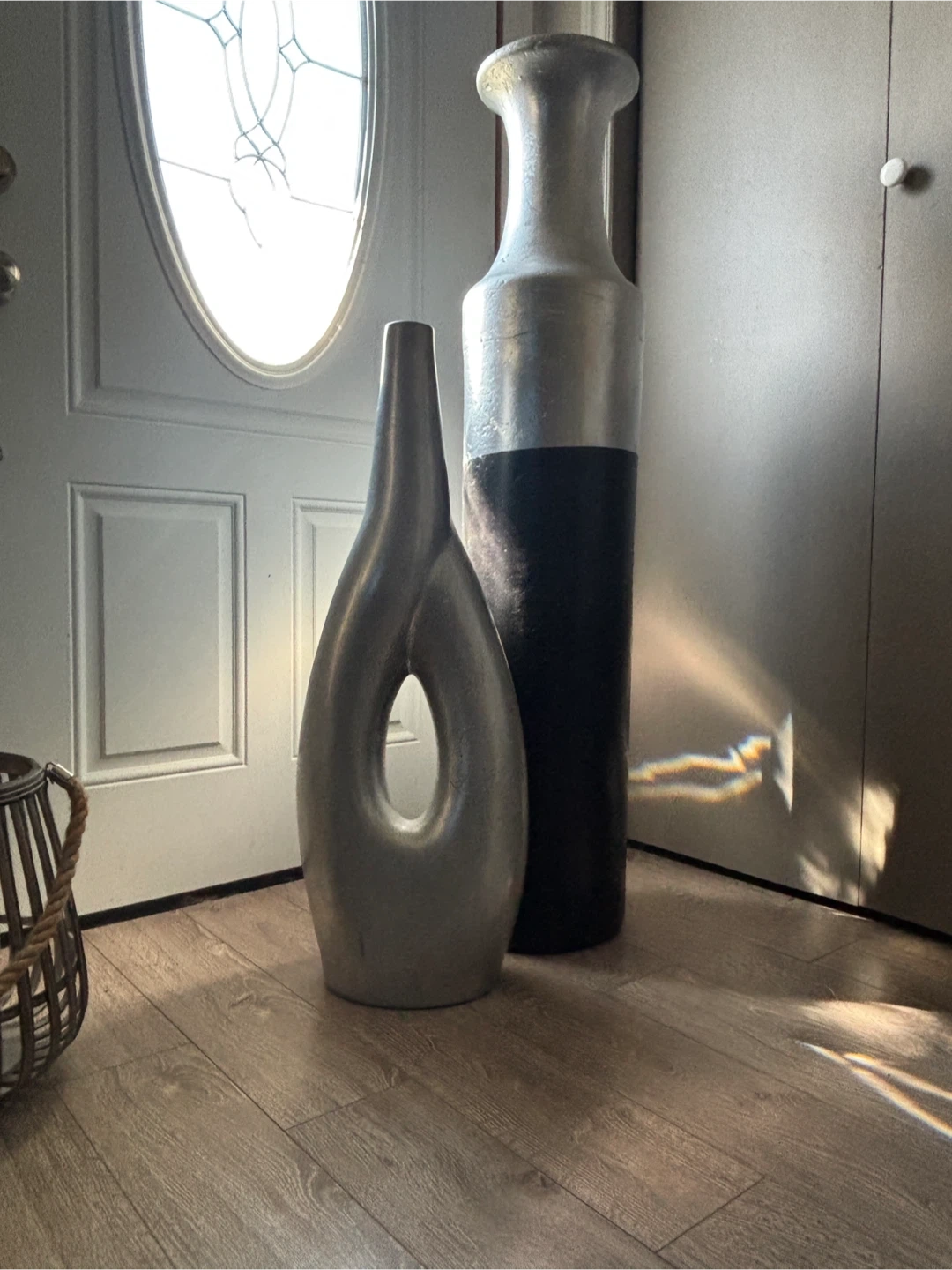 Two decorative vases for sale! One is silver and about 32 inches tall, and the other is silver and black and about 47 inches tall. They're in great condition and would look lovely in any home. $100 for both or $60 each