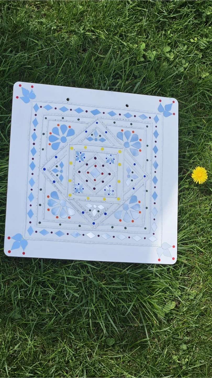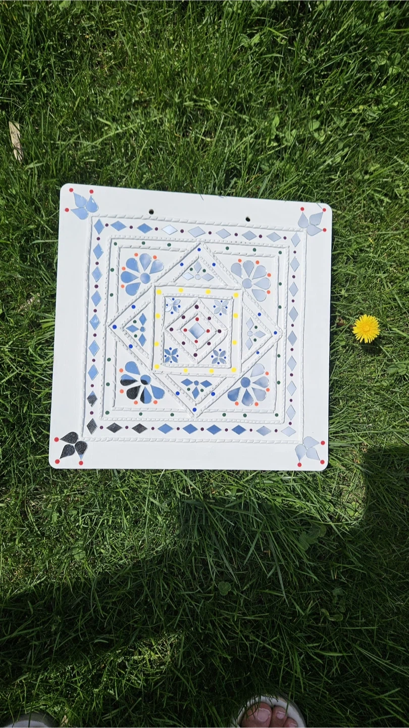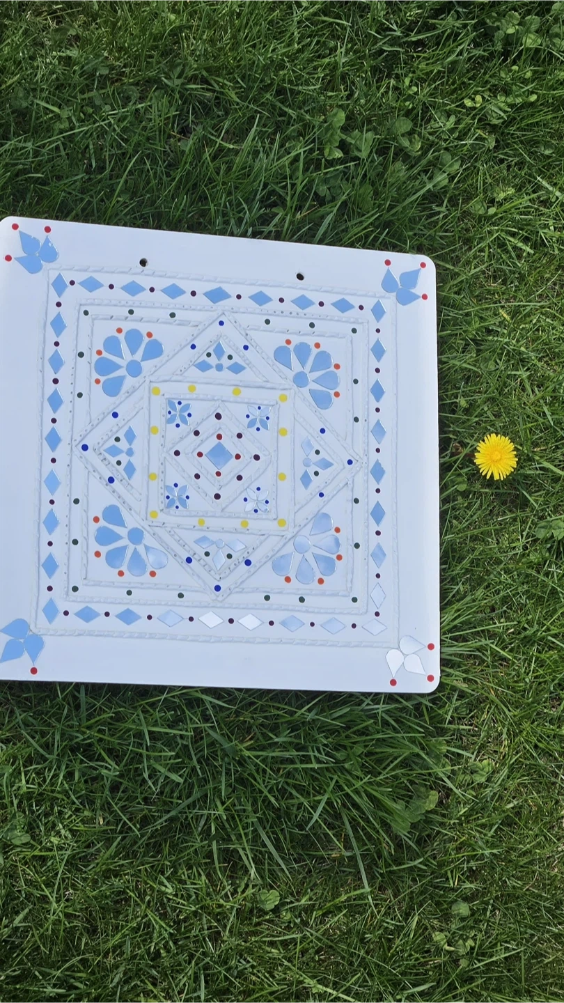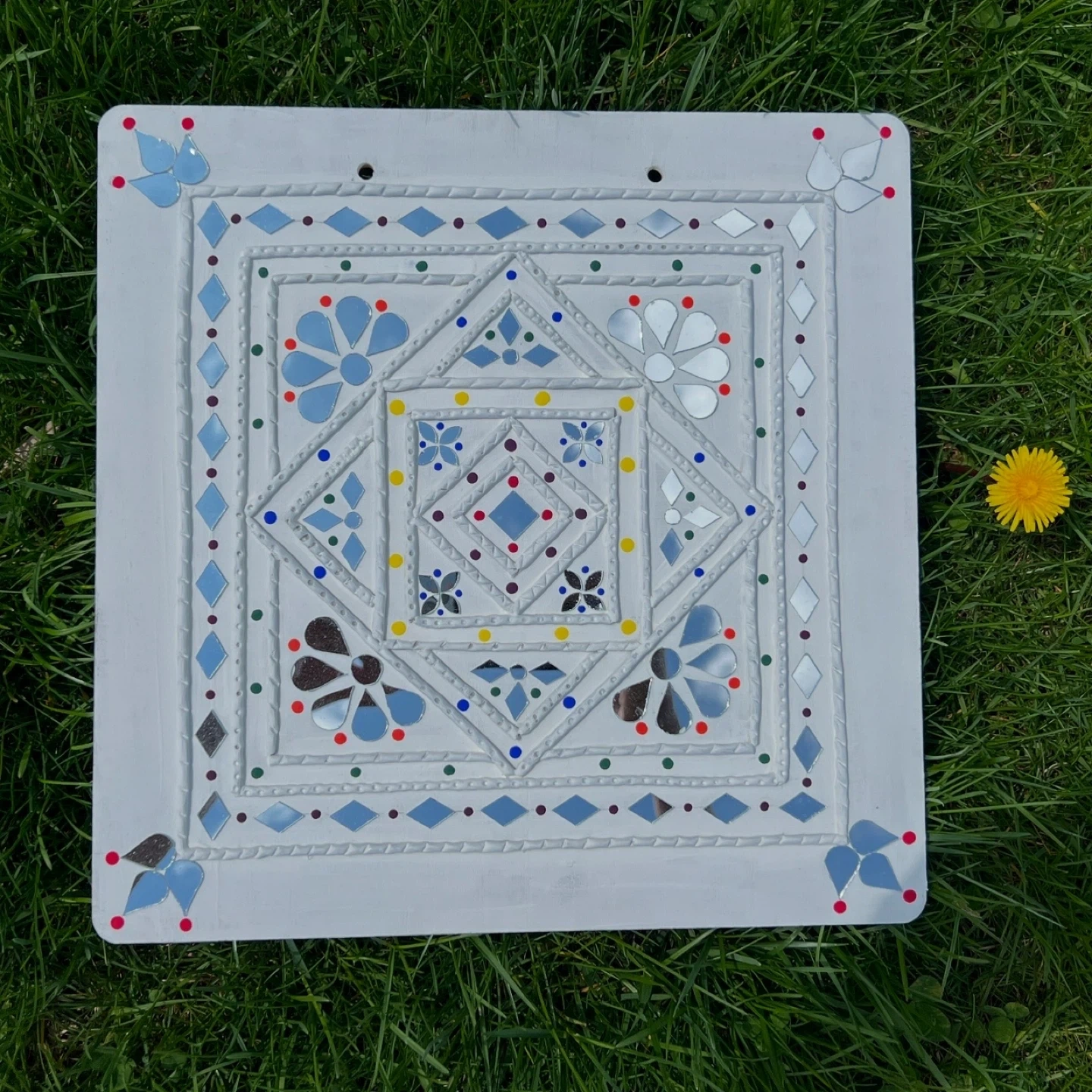 This is a decorative square wall art piece. It features a white base with a mosaic-like design consisting of blue, yellow, and red accents. It would look great in any room!