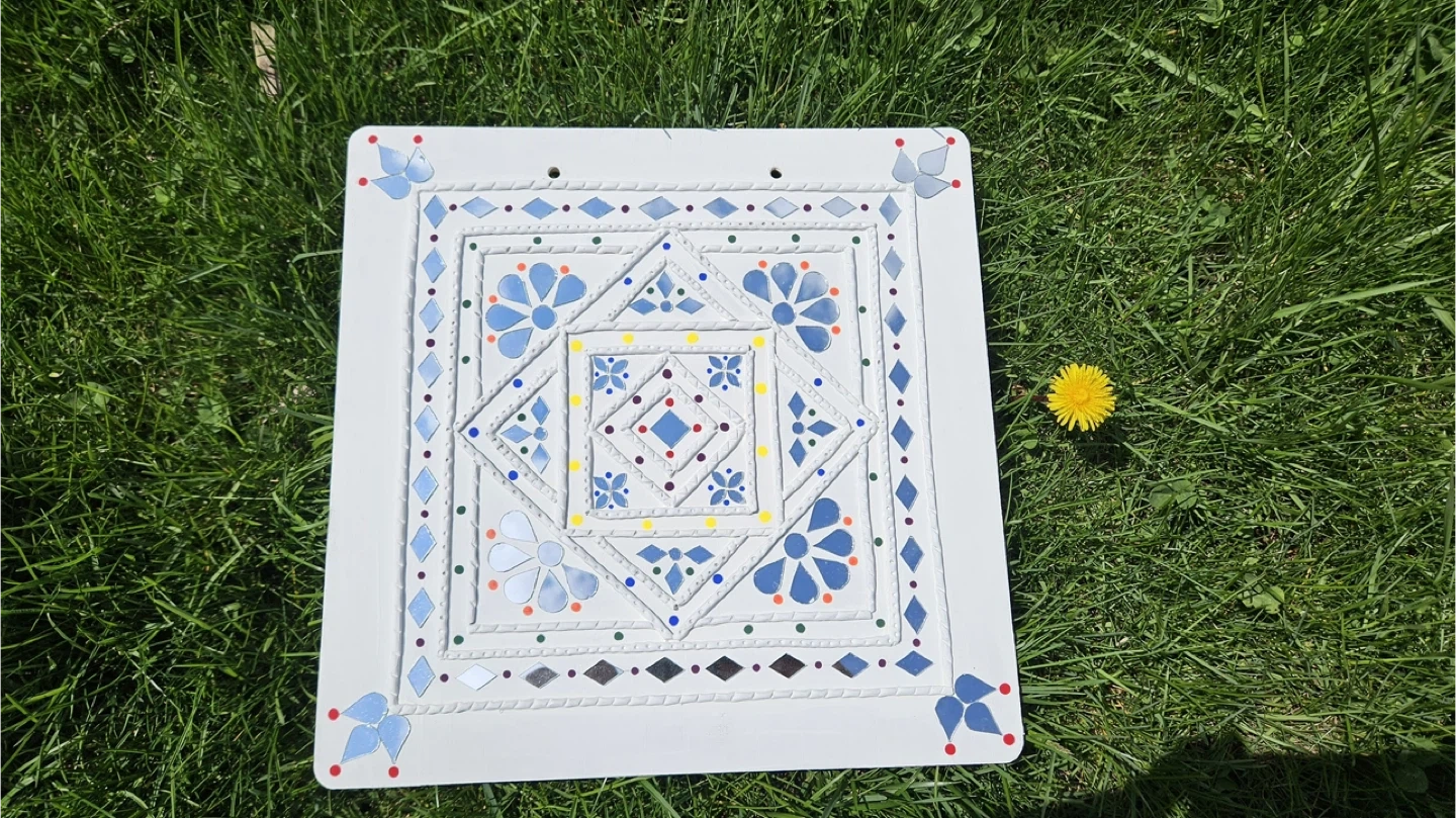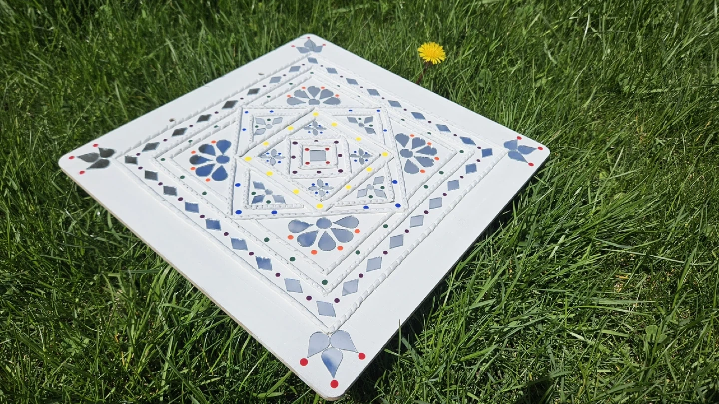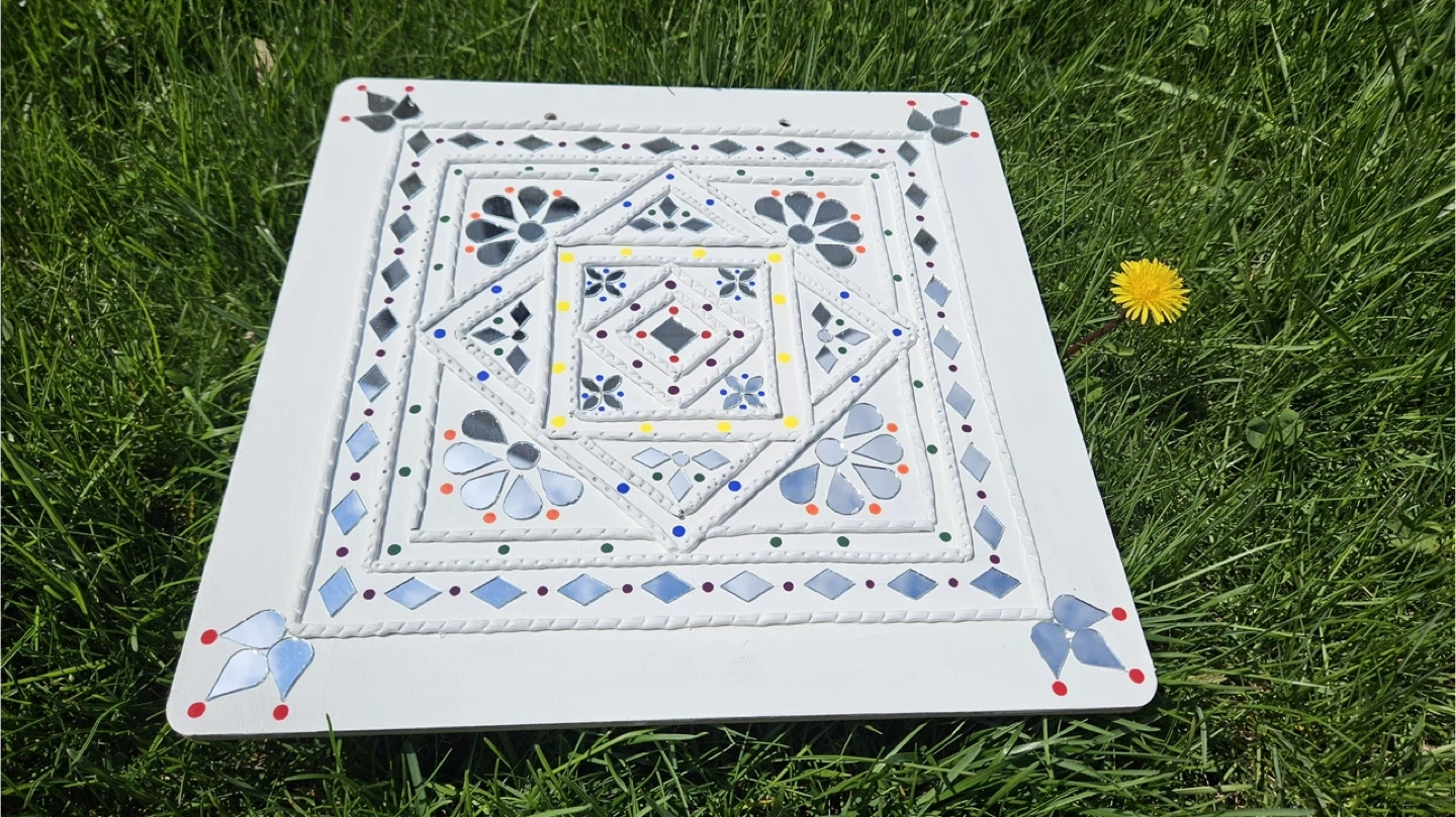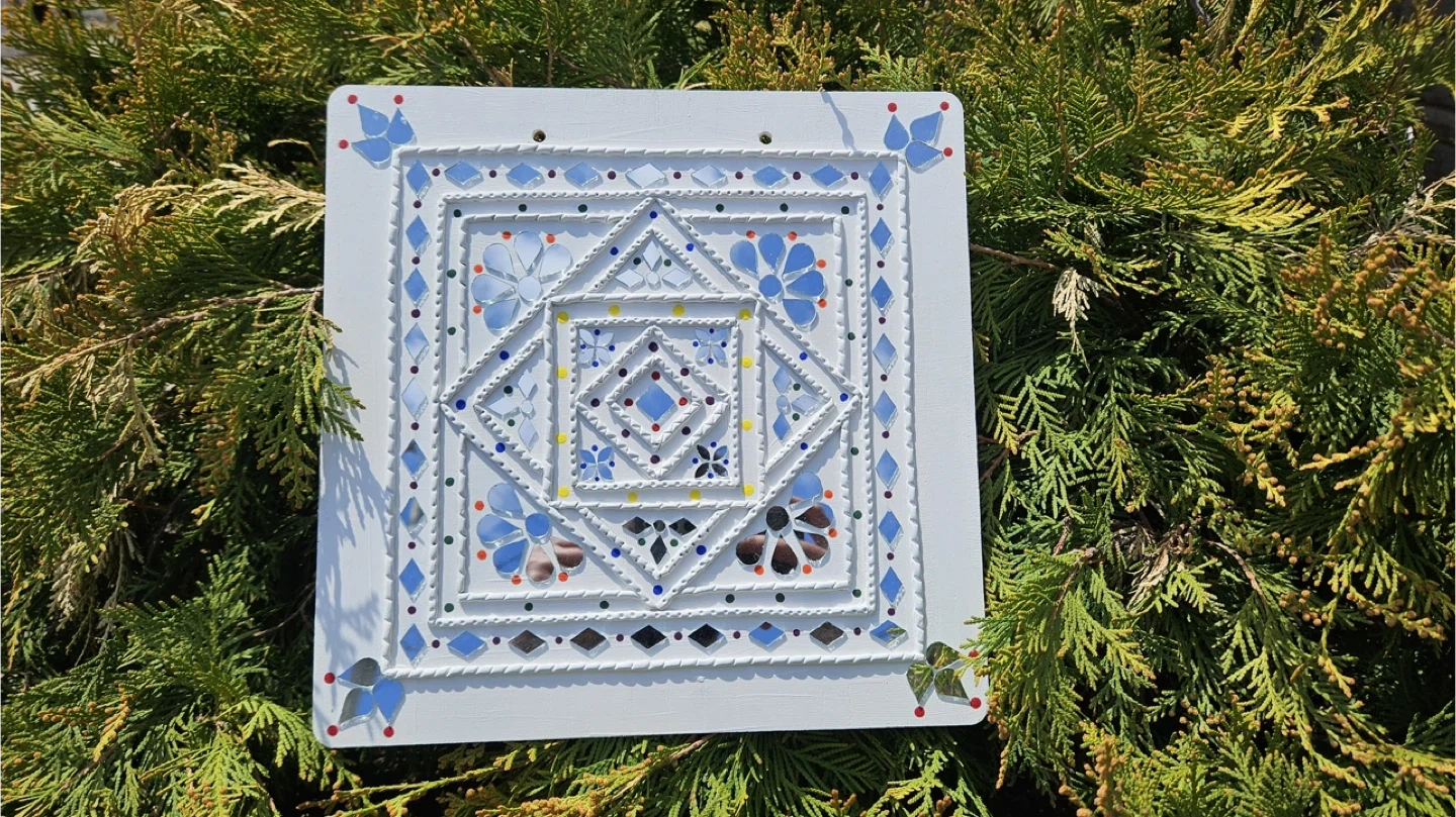 This is a decorative square wall art piece. It features a white base with a mosaic-like design consisting of blue, yellow, and red accents. It would look great in any room!