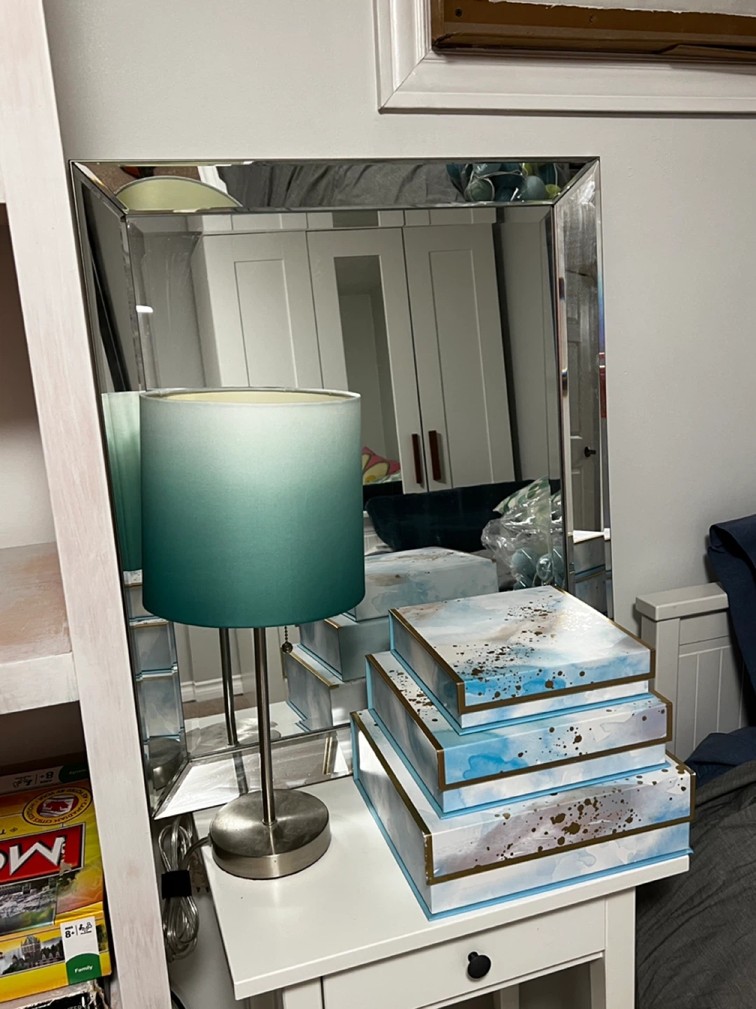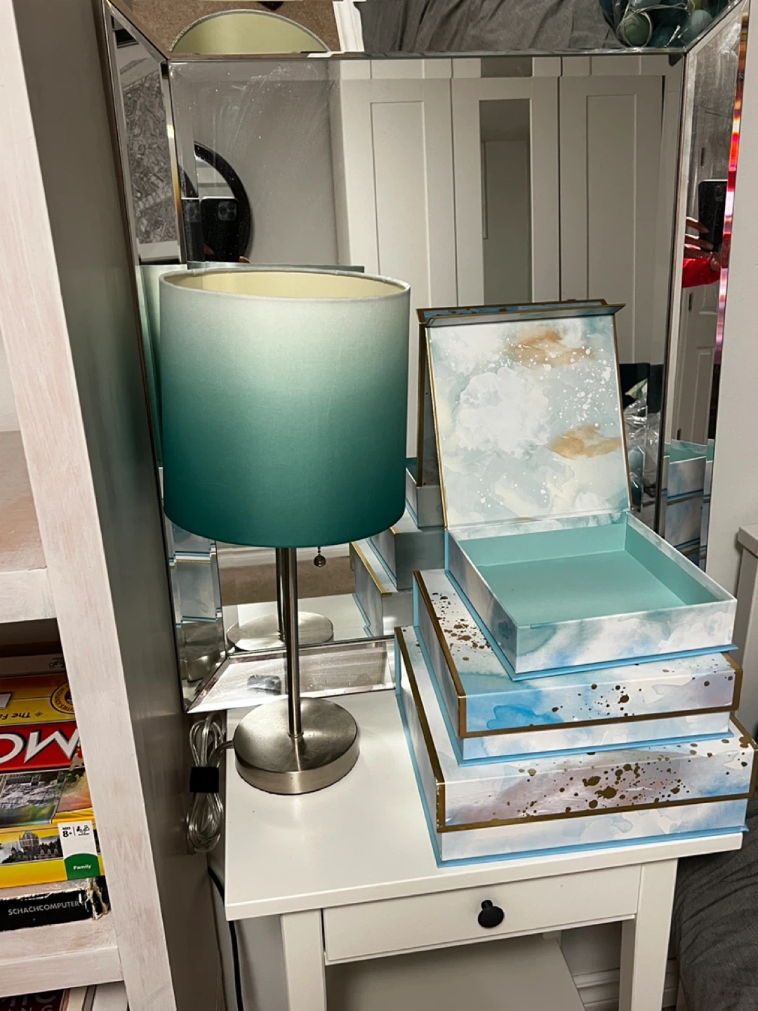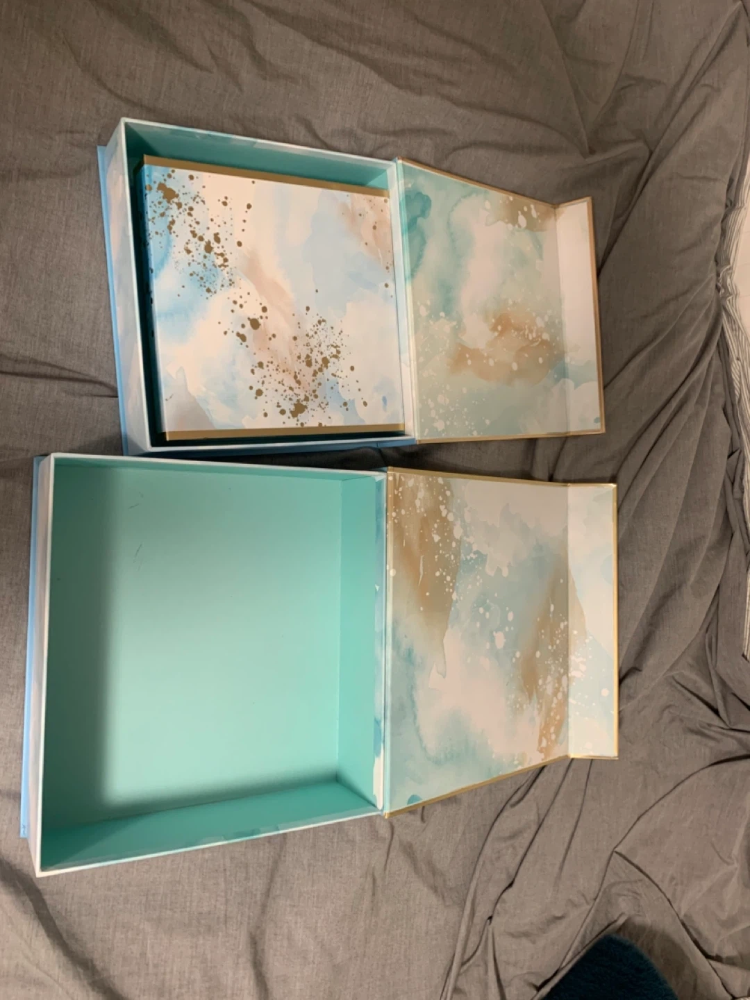 Selling a set of 3 decorative stacking boxes! They feature a beautiful watercolour design in light blues, whites, and gold accents. These boxes are perfect for adding a touch of elegance to any room while providing stylish storage made of cardboard light weight.