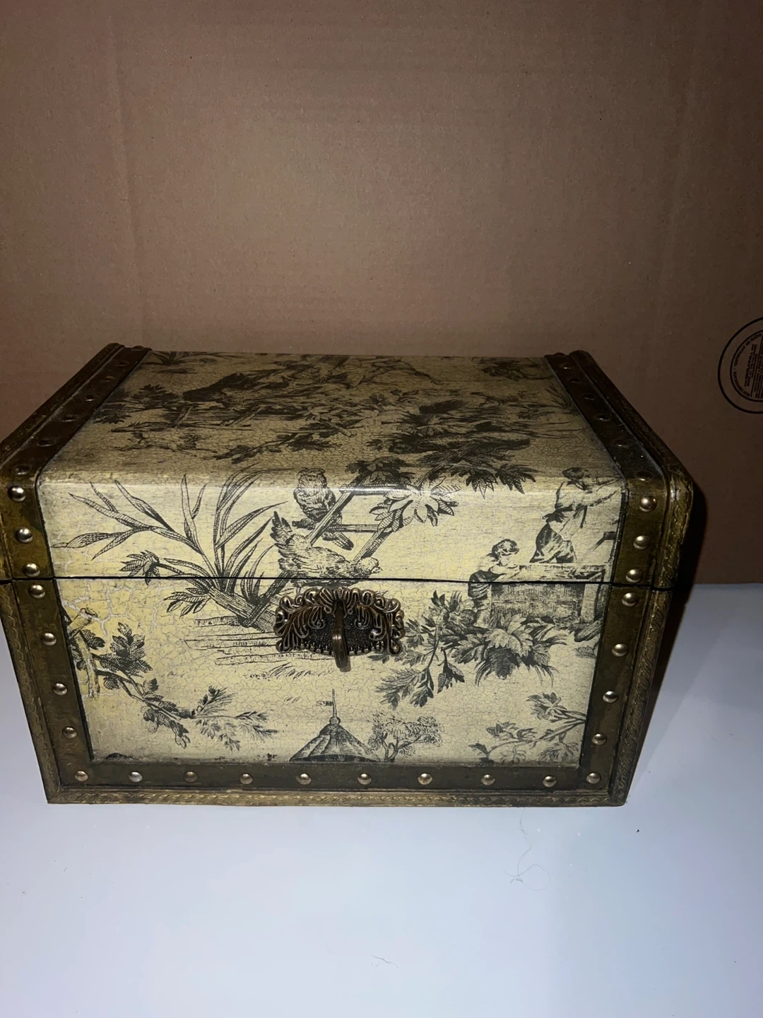 Selling a cute decorative storage box. It features a unique design with black and white toile pattern and brassy metal trim. Perfect for adding a touch of vintage charm to any room!