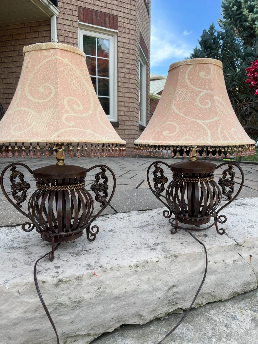 Selling decorative table lamps. They feature a unique metal cage base and a patterned pink lampshade with beaded trim. They'd be a lovely addition to any room! $10 each