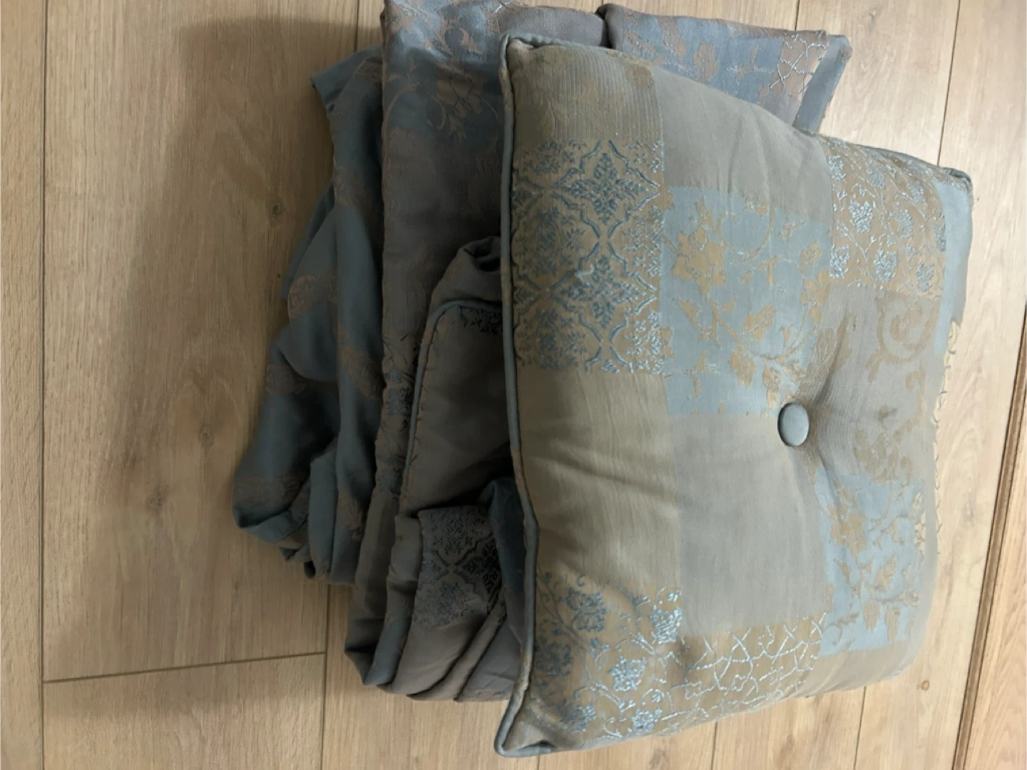 A set of decorative throw pillows in a lovely blue and gold pattern. They add a touch of elegance to any room! Great for sofas, beds, or accent chairs