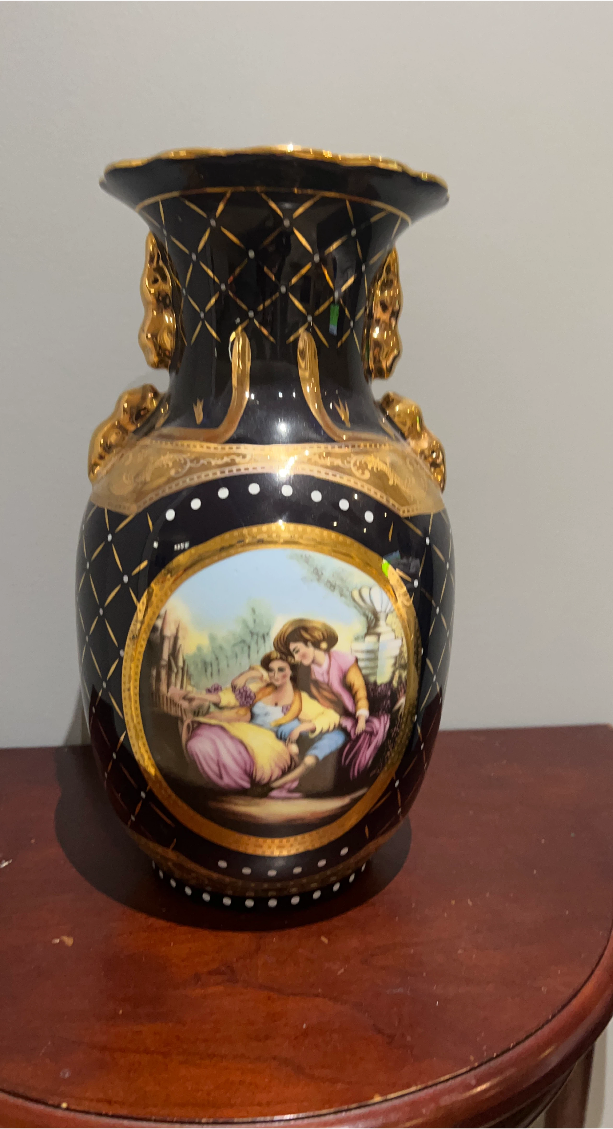Beautiful decorative vase with a black and gold design! It features an elegant image and ornate details. Perfect for adding a touch of sophistication to any room