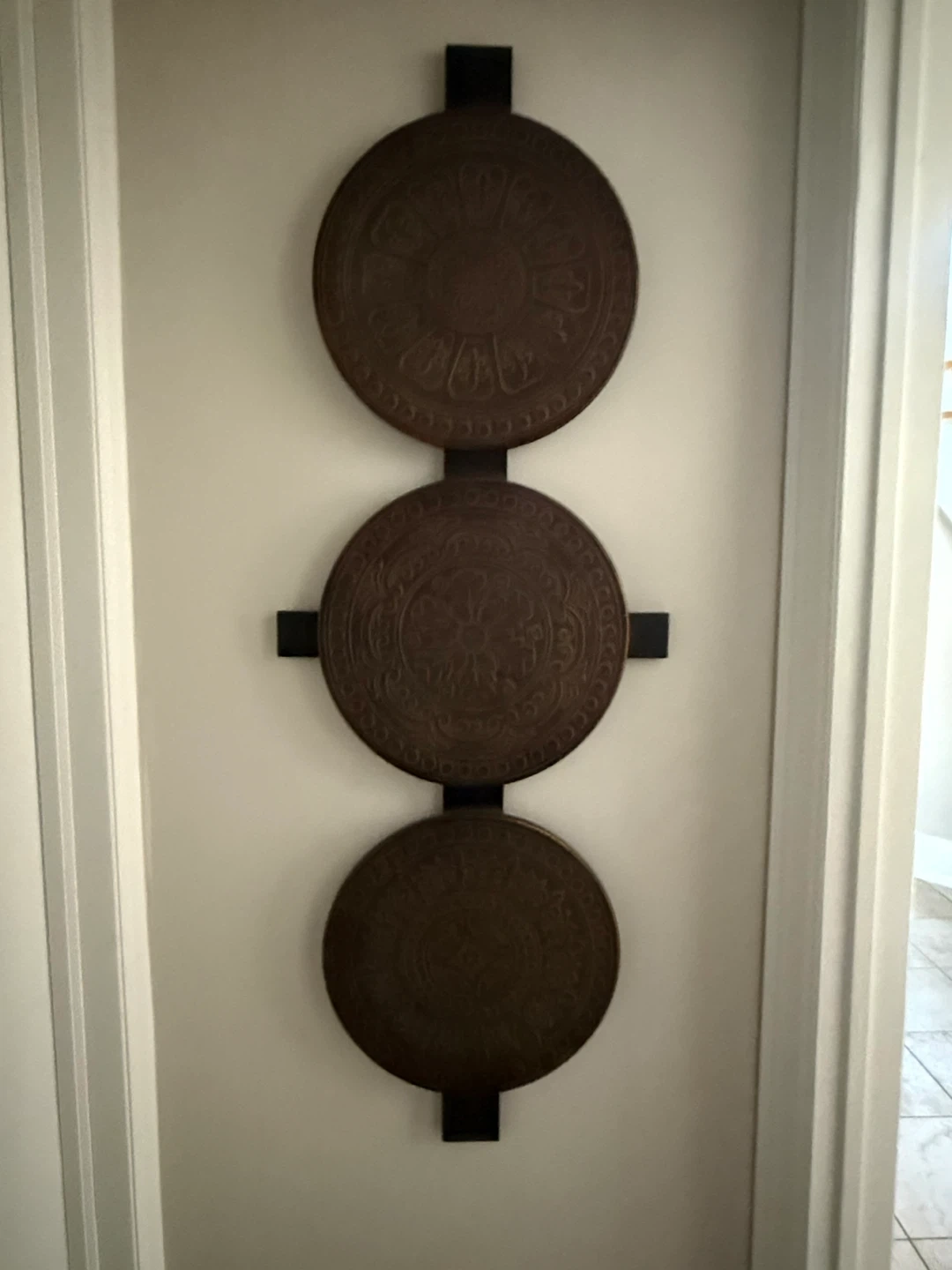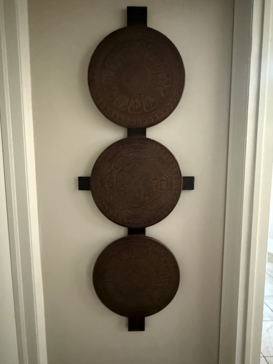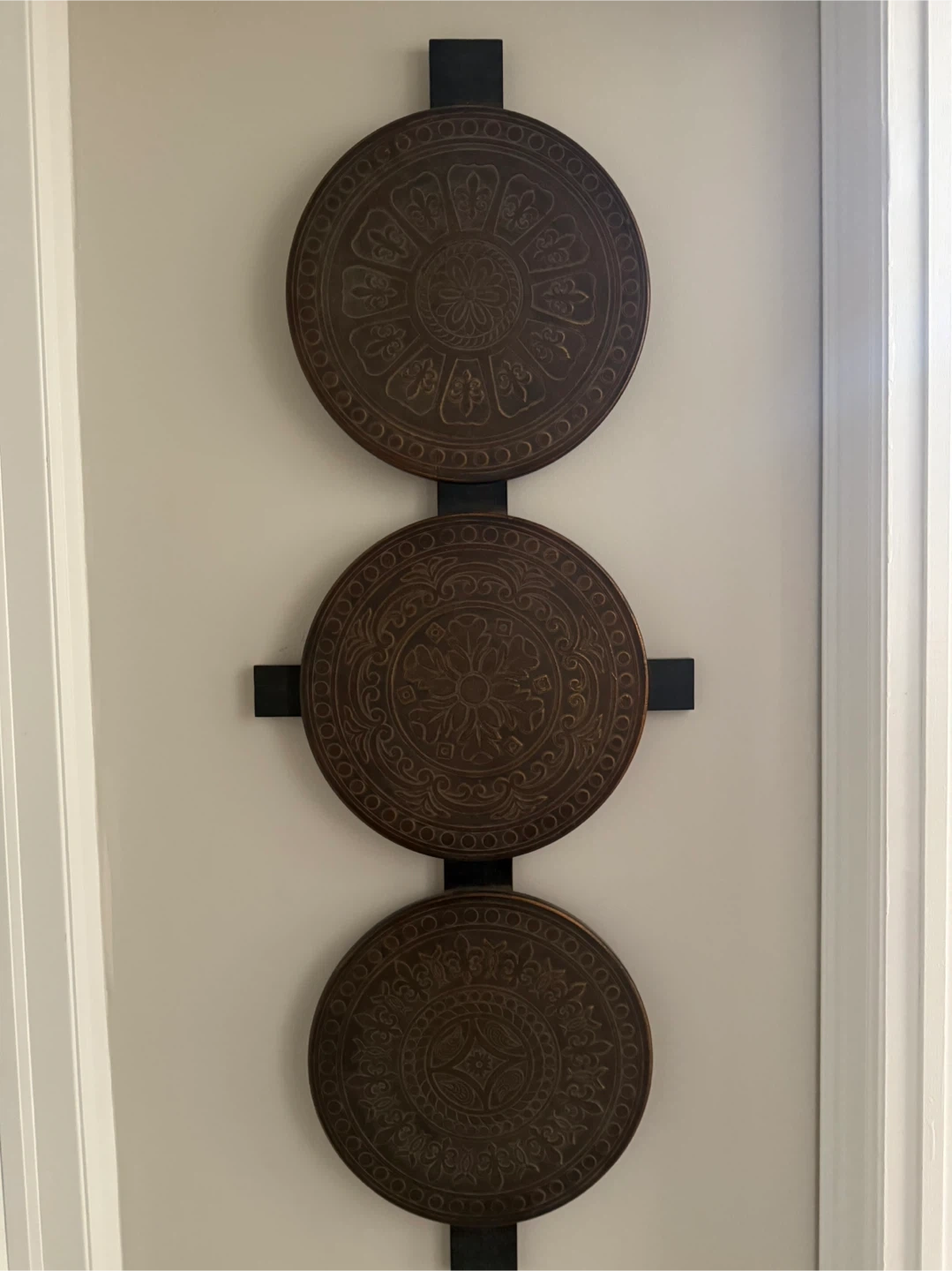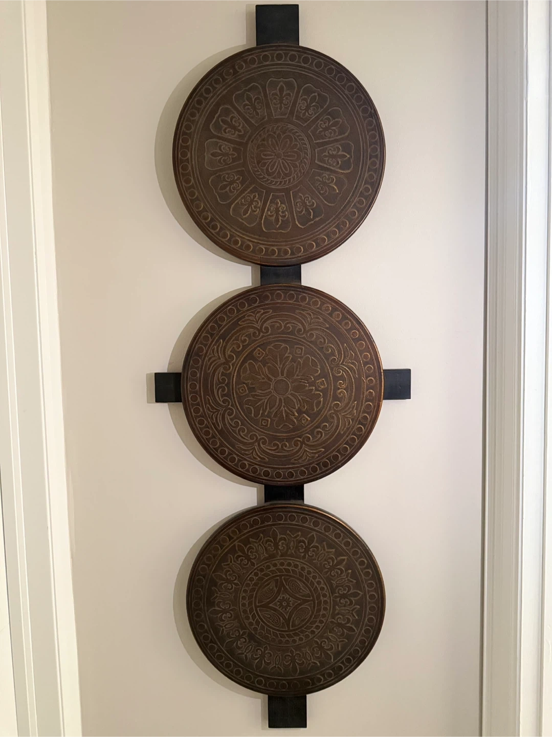Here's a unique piece of wall art that features three round wooden panels. Each panel has a different intricate design, adding a touch of elegance to any room. It's in great condition and ready to be hung up in your home!
