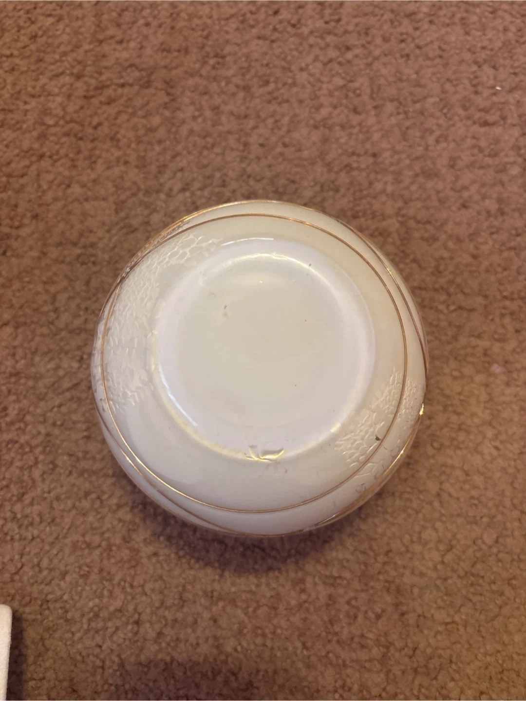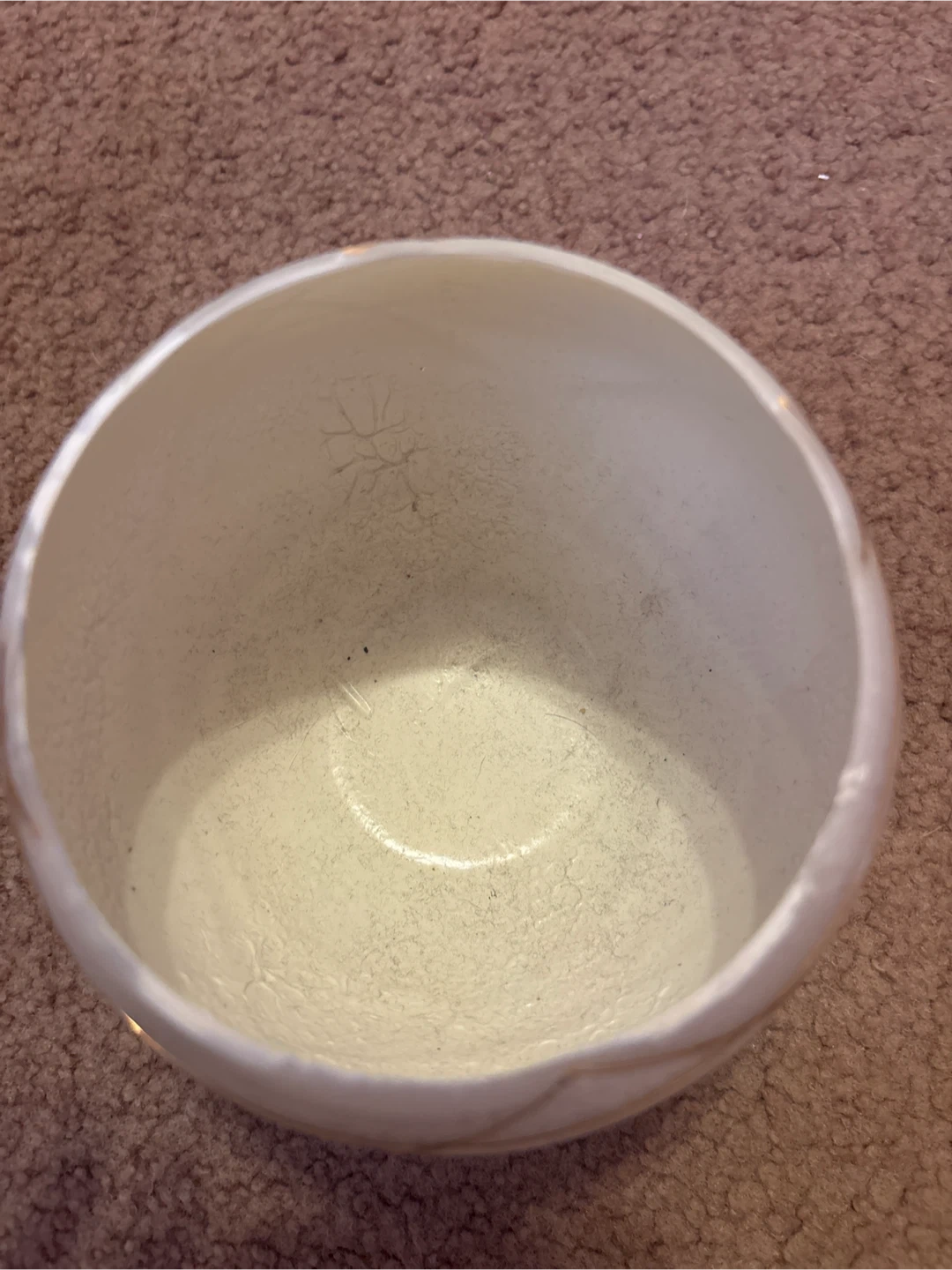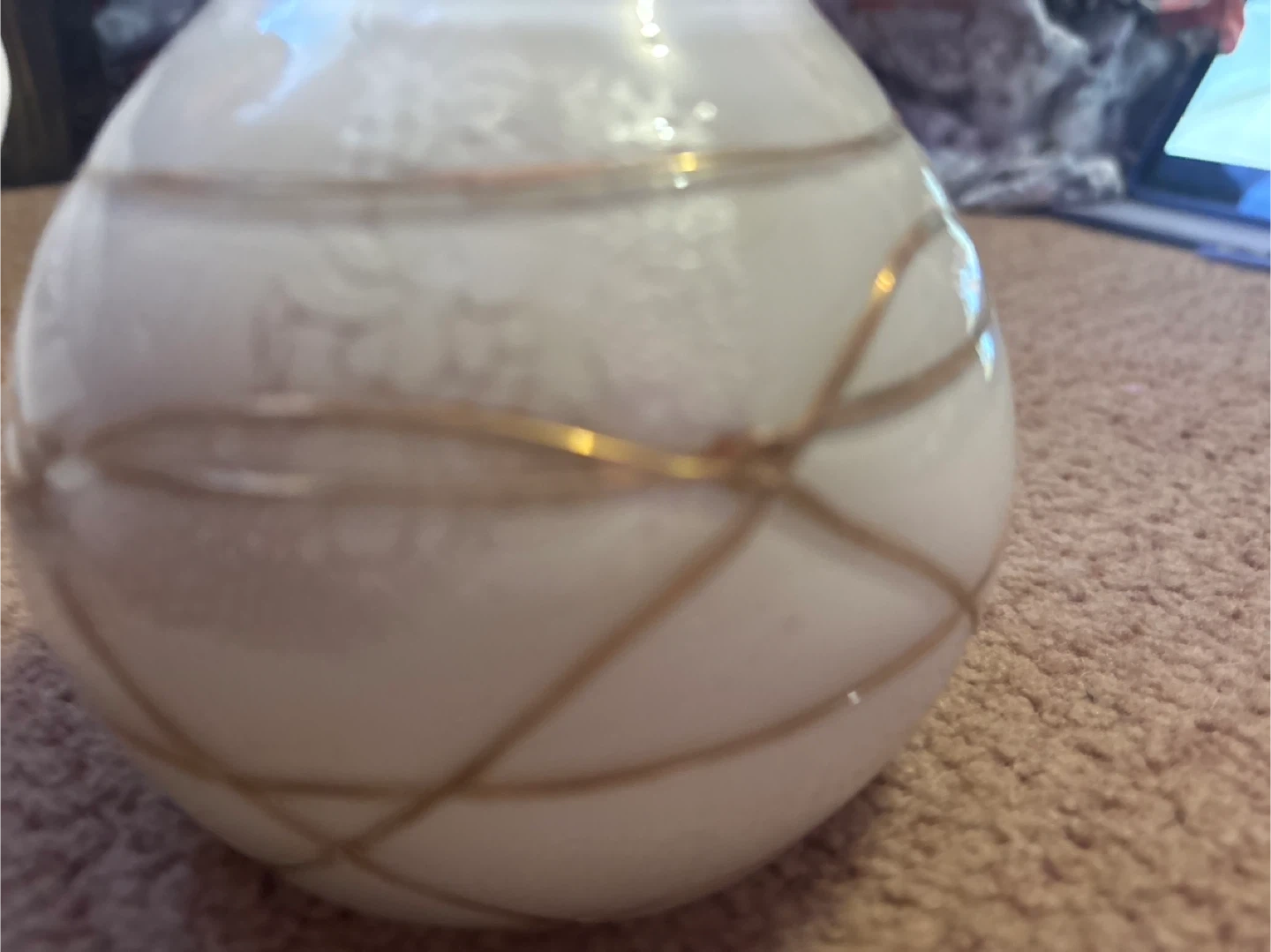 Selling a lovely decorative vase! It's a round shape, white in colour, and has gold accents. Perfect for adding a touch of elegance to any room