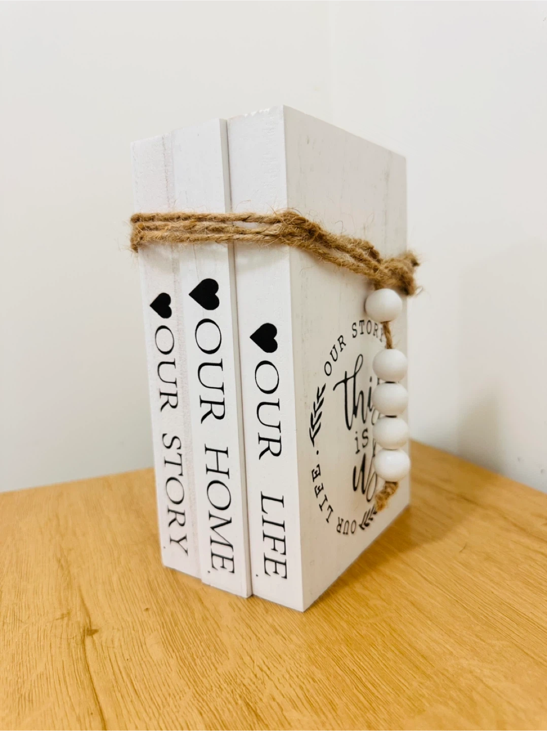 Add a touch of charm to your home with this decorative wooden book stack! The stack features three faux books with the phrases 'Our Life,' 'Our Home,' and 'Our Story' printed on them. A rustic jute rope and bead accent complete the look, making it a sweet addition to any shelf or table. 7X 5.5X 2.5'