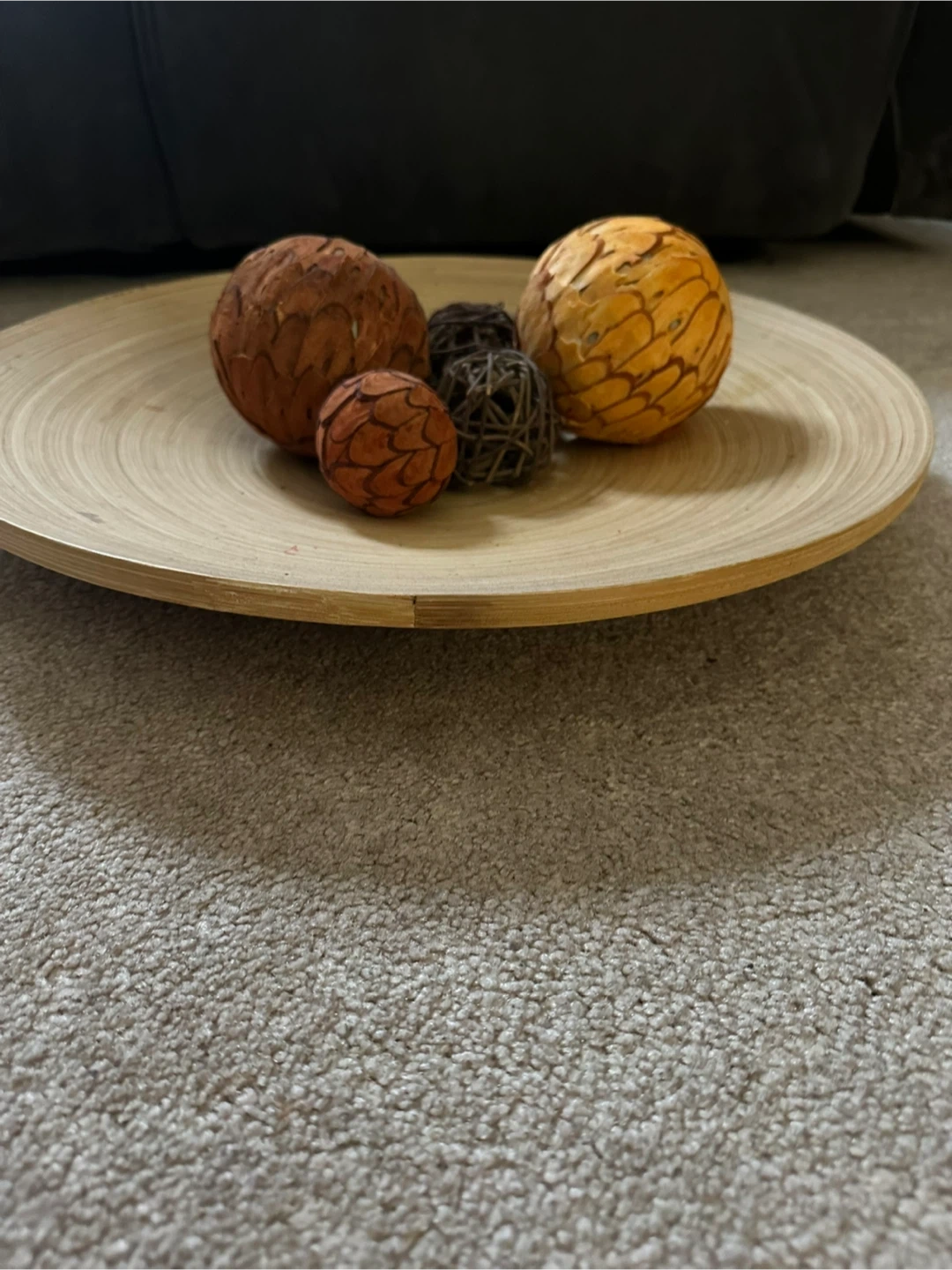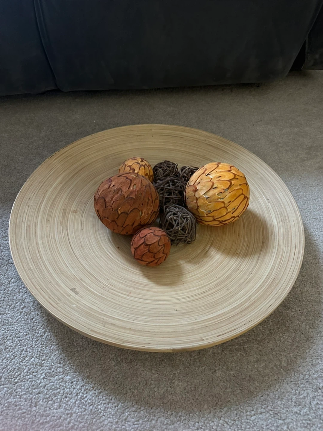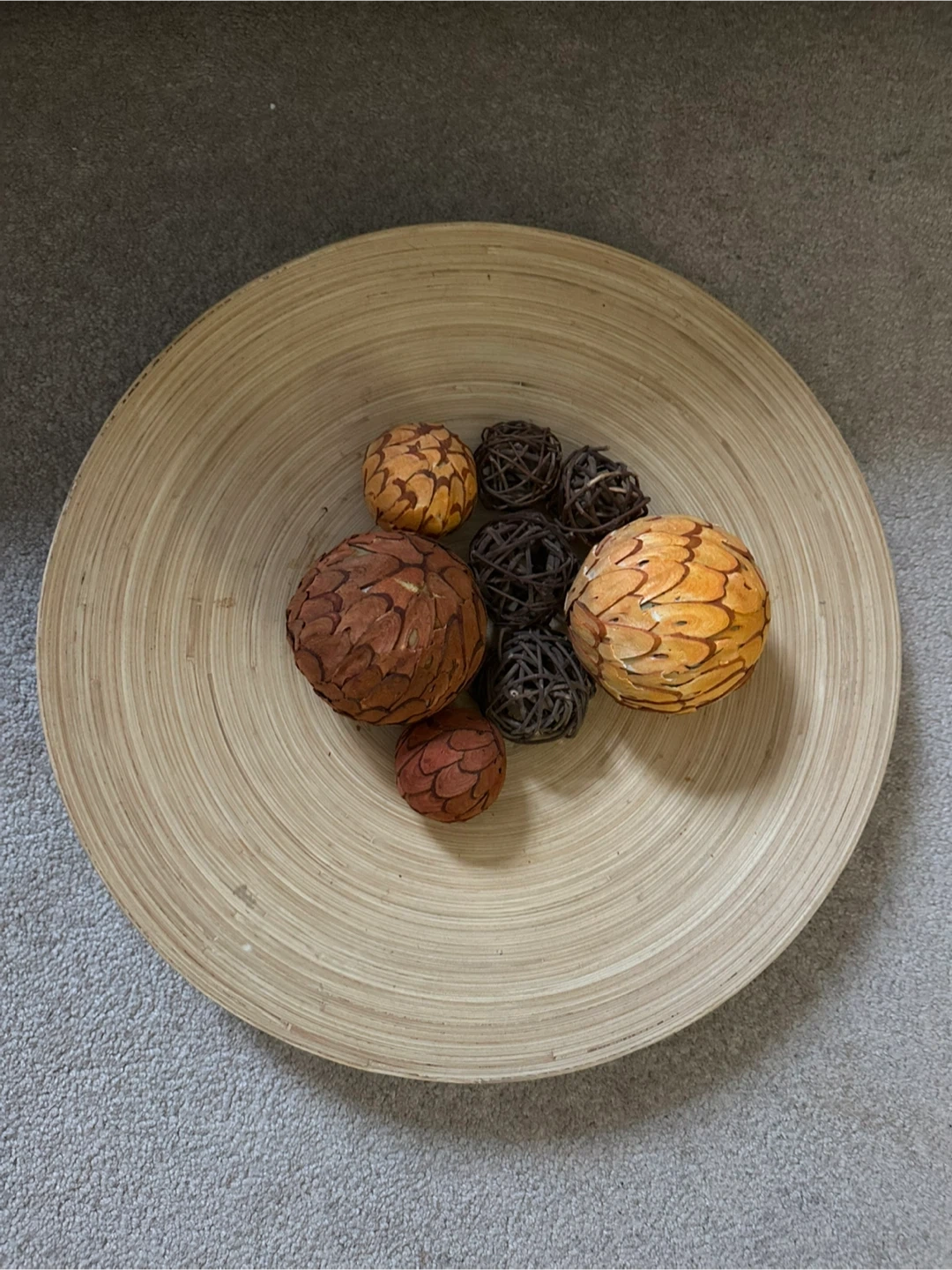 Add a touch of natural charm to your space with this decorative wooden bowl. It comes with a set of decorative orbs in various textures and colours. Perfect for a coffee table or shelf display, this set brings a warm and inviting feel to any room