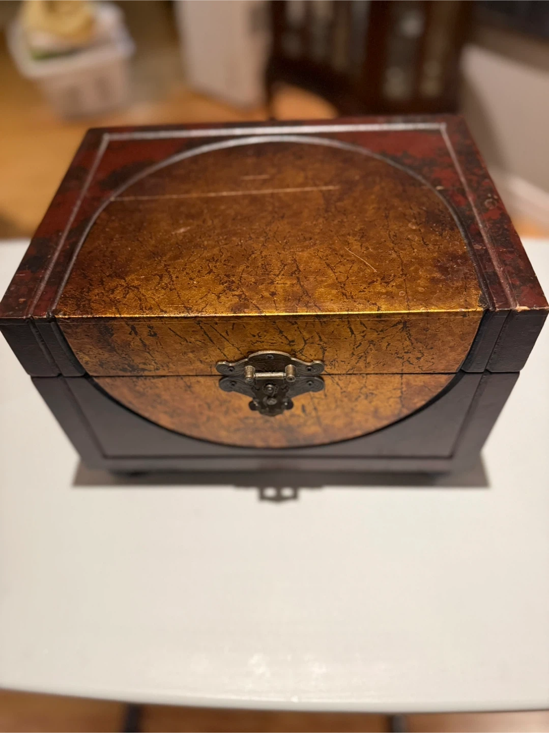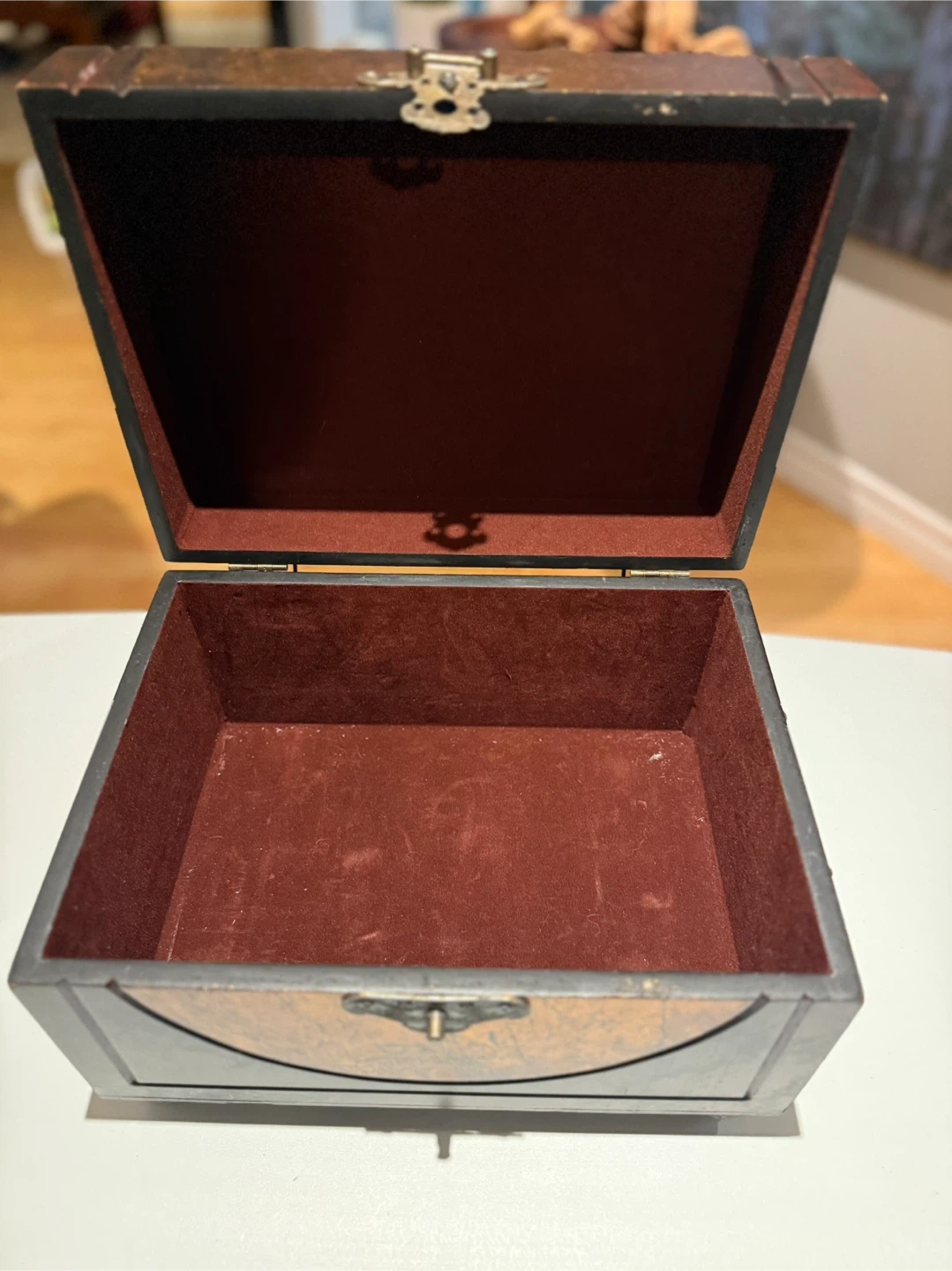 I'm selling a lovely decorative wooden box! It has a latch closure and a drawer at the bottom. The interior is lined with a soft, maroon-coloured fabric. Perfect for storing small treasures or adding a touch of elegance to your space!