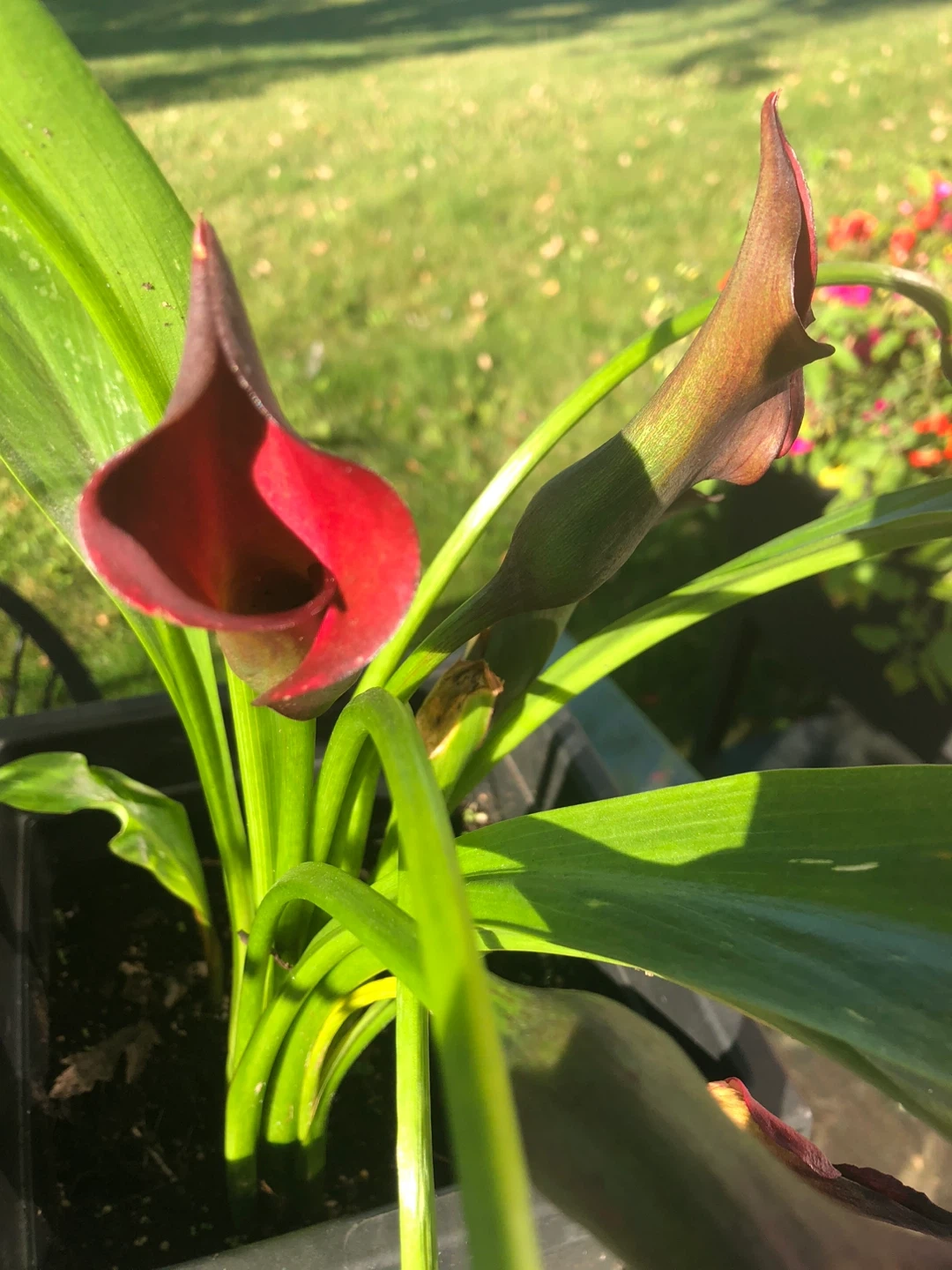 I have a beautiful calla lily plant for sale. It has been outside in a shady area blooming continuously all summer. As it is a tropical houseplant, it is time to bring it inside. Some people describe the flowers as dark purple, but to my eye, they are dark red black.The flowers bloom for a long time and add a touch of elegance. They should be transplanted into an indoor pot.