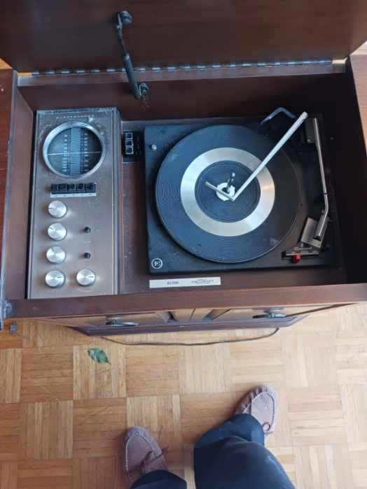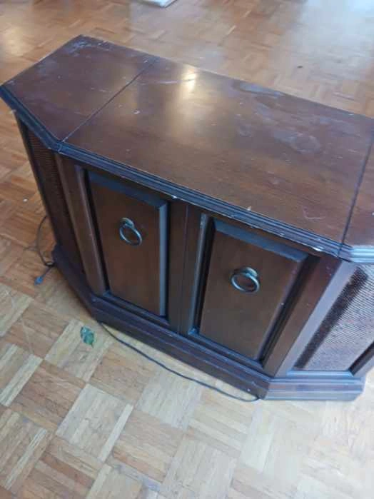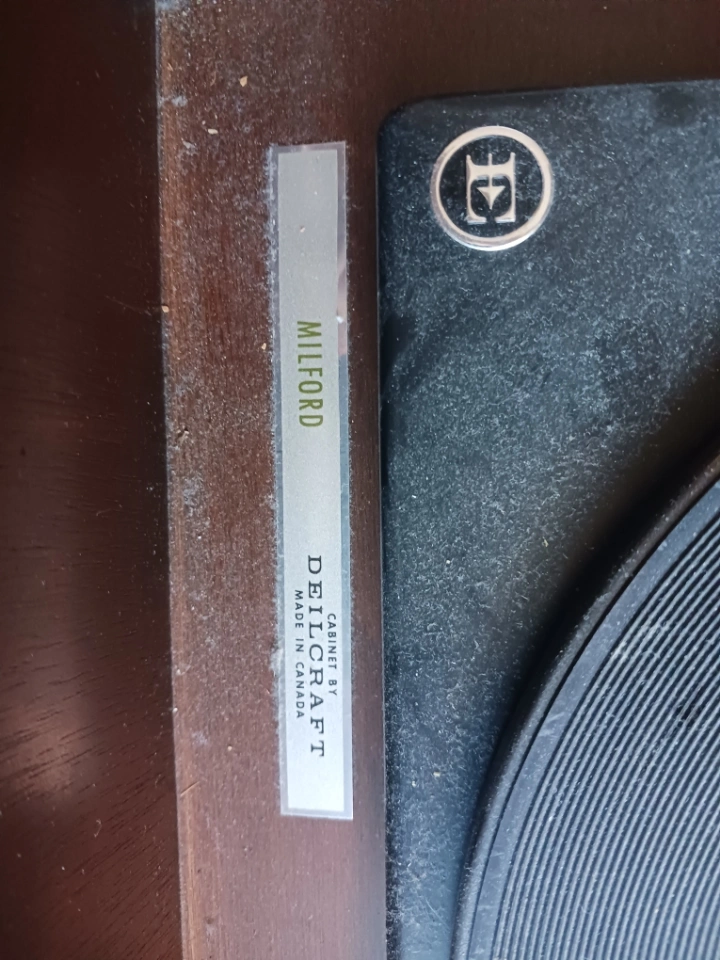 Selling a Deilcraft Milford record player cabinet. It's a cool vintage piece with a built-in record player and radio. The cabinet is made of wood and has a nice, classic look. It is made in Canada