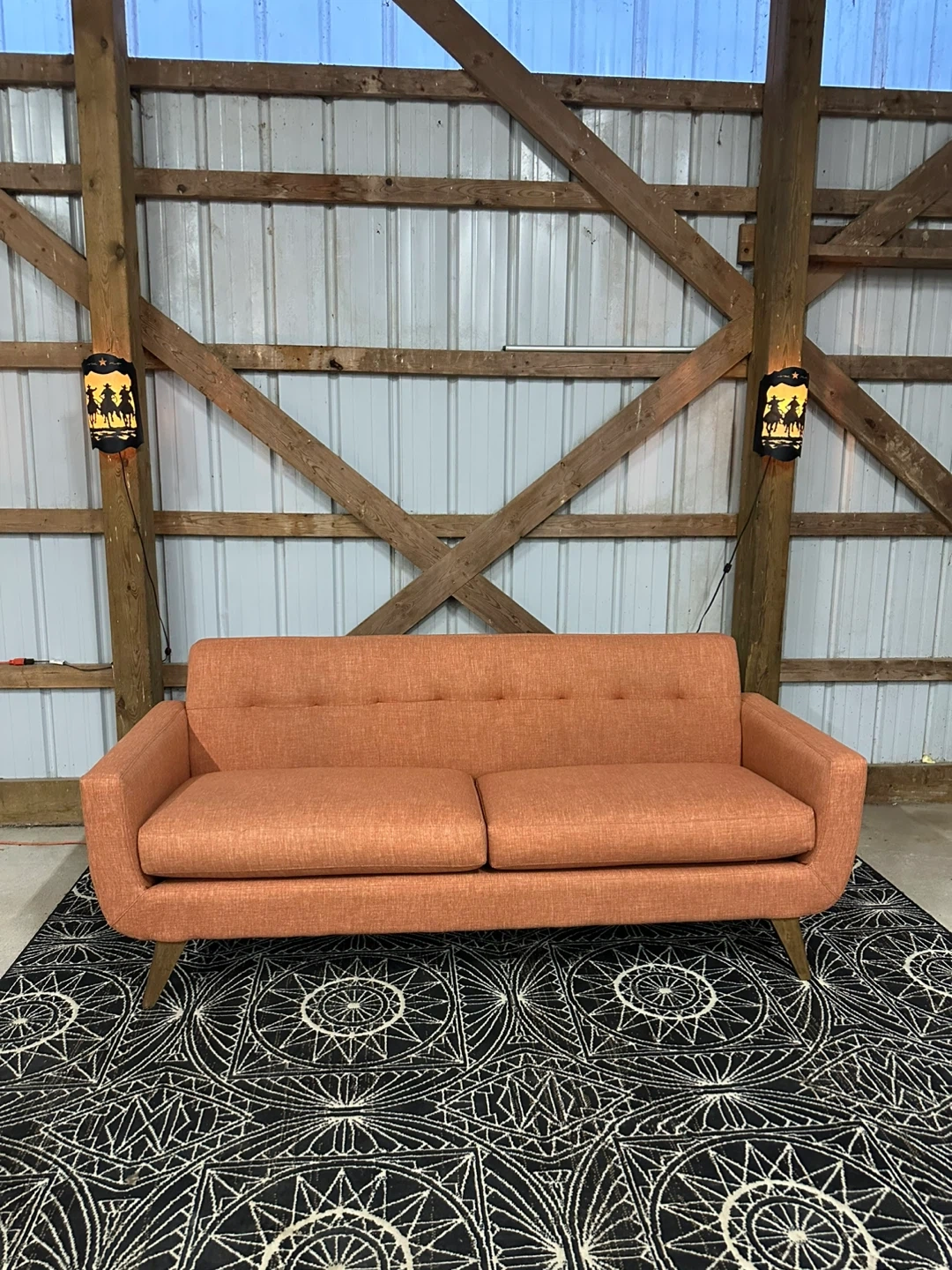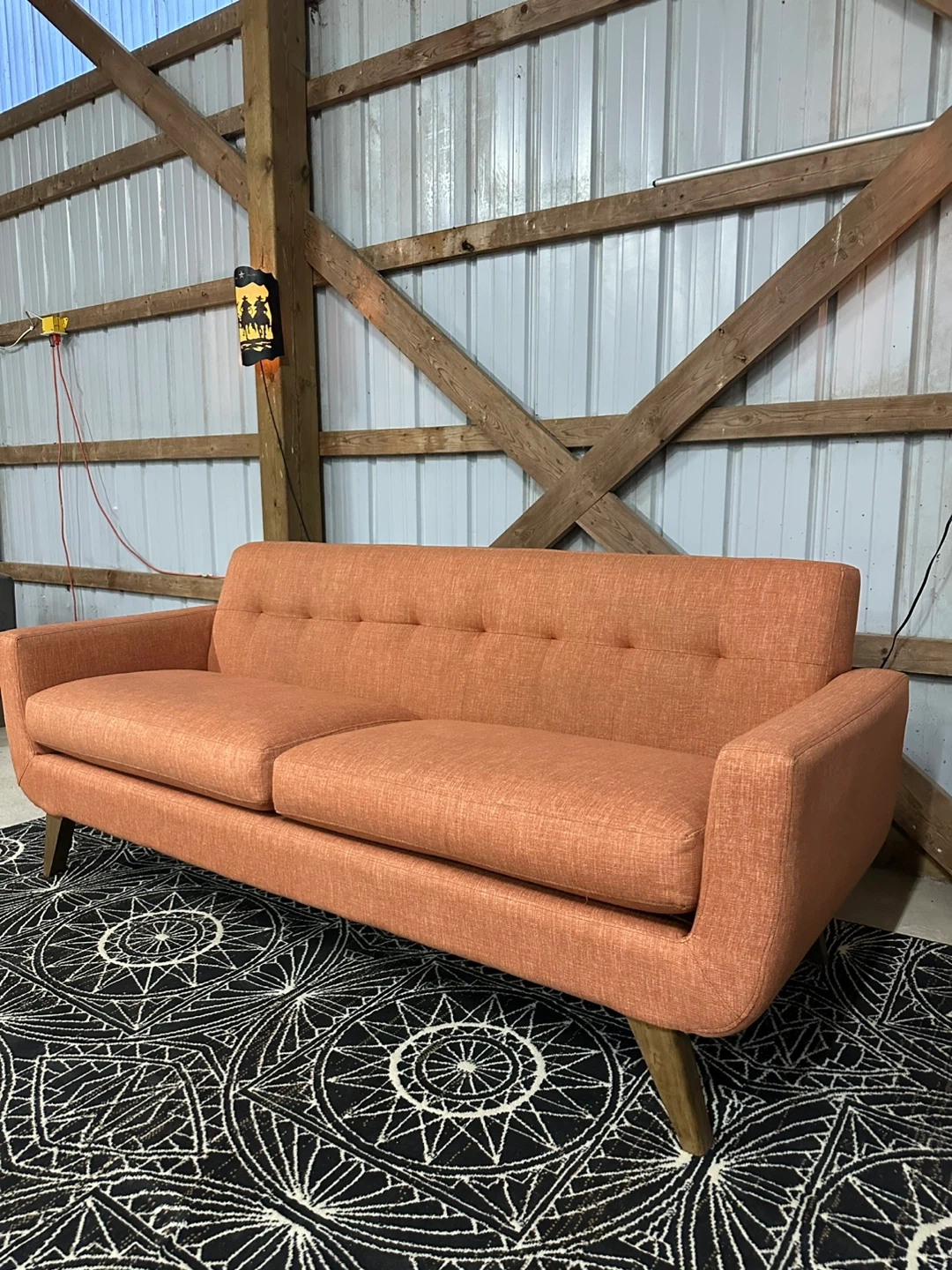 **$450** MCM Style Sofa 🛋️ This sofa has been professionally shampooed and steam cleaned. 🧼🫧 Features - seats 3 - wooden style legs - removable cushion covers - Easy to clean fabric -strong frame Dimensions in photos Delivery available, send location for a quote 😊 Couch disposal available too.