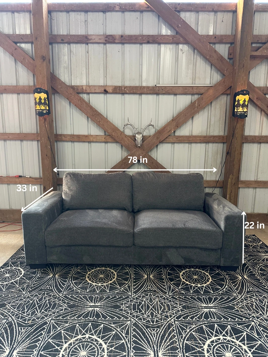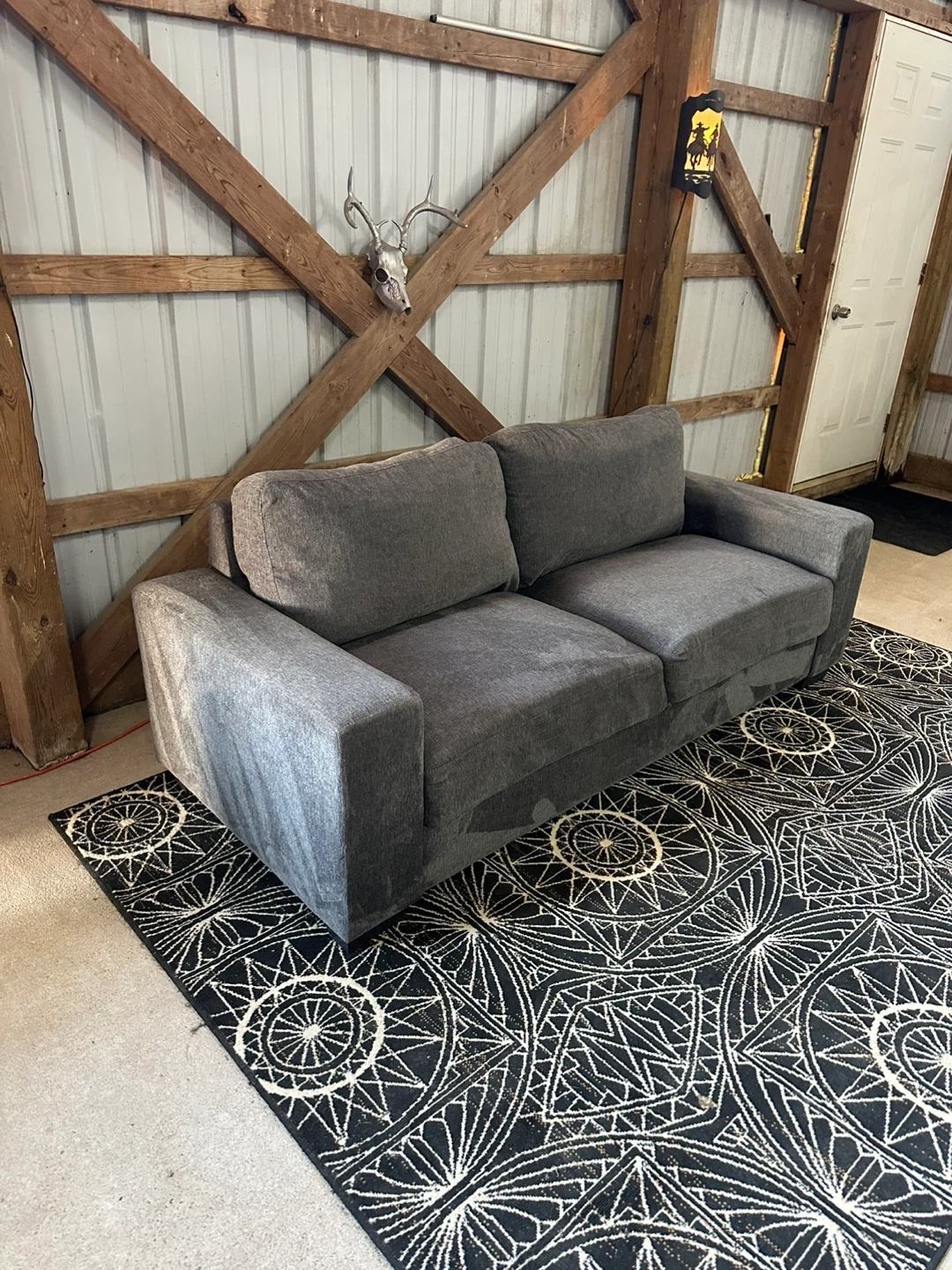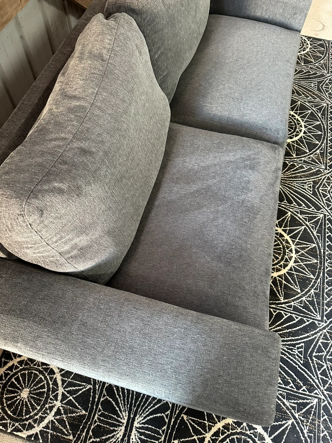 **$350** Modern Grey Fabric Sofa🛋️ This sofa has been professionally shampooed and steam cleaned. 🧼🫧 Features - seats 3 - easy to clean fabric - inside of right armrest indented but doesn’t affect comfort. (See video) - Easy to clean fabric -strong frame Dimensions in photos Delivery available, send location for a quote 😊