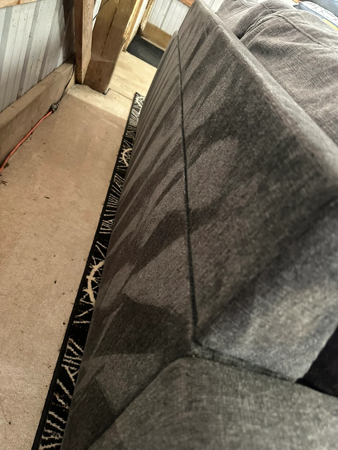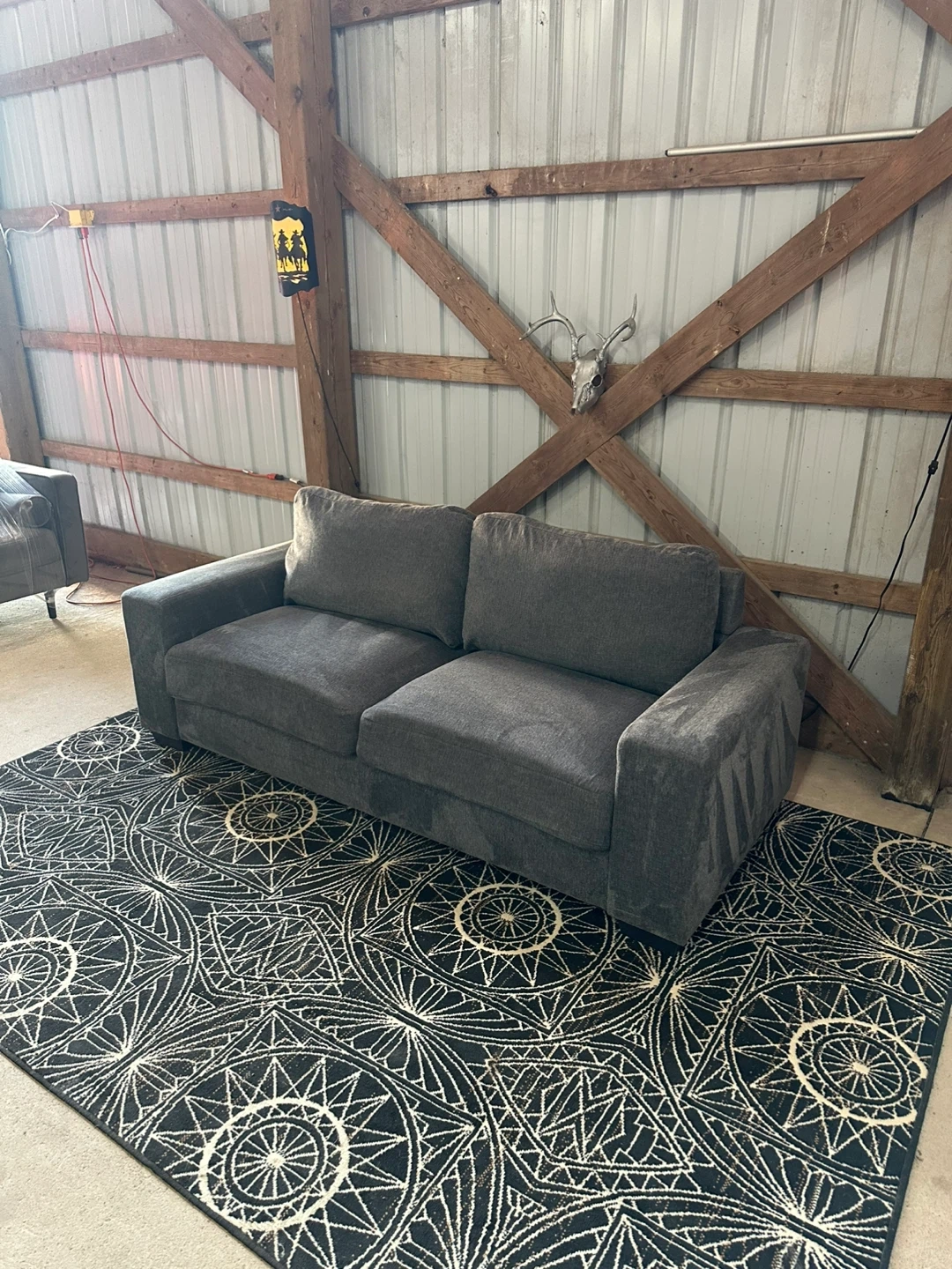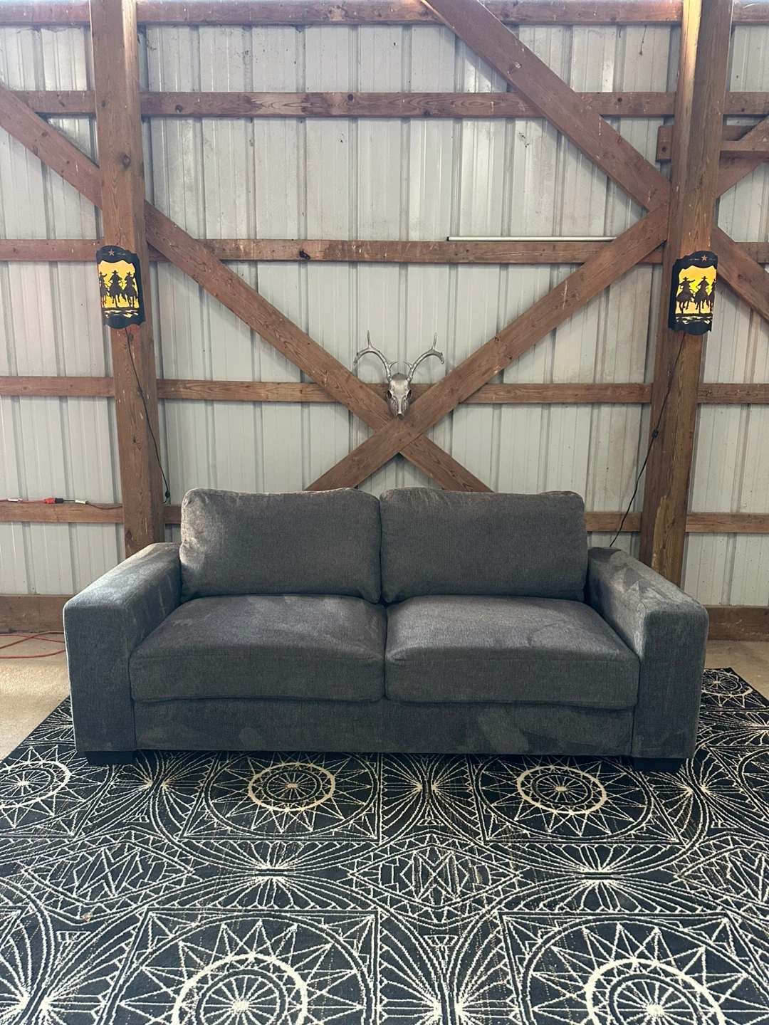 **$350** Modern Grey Fabric Sofa🛋️ This sofa has been professionally shampooed and steam cleaned. 🧼🫧 Features - seats 3 - easy to clean fabric - inside of right armrest indented but doesn’t affect comfort. (See video) - Easy to clean fabric -strong frame Dimensions in photos Delivery available, send location for a quote 😊