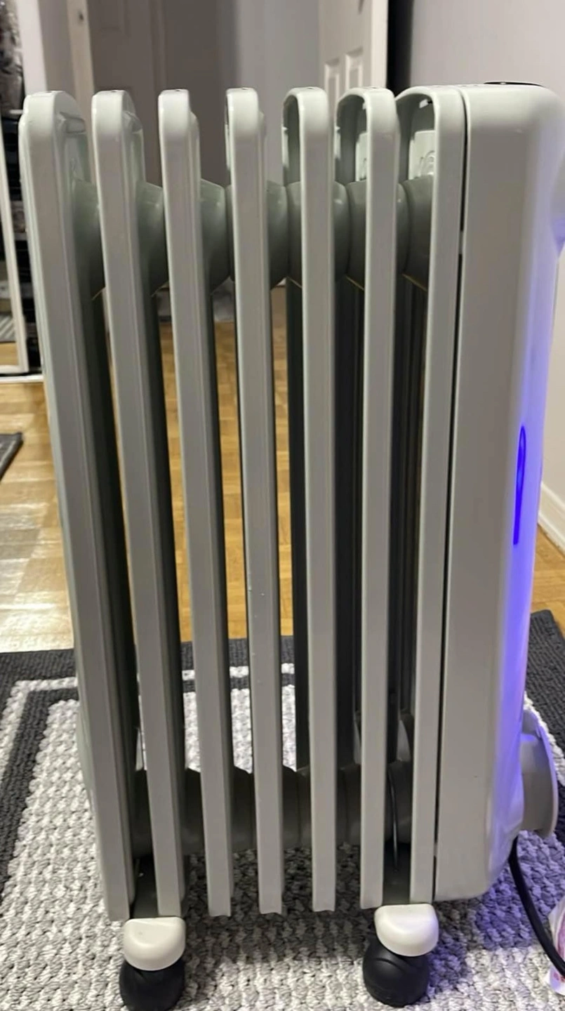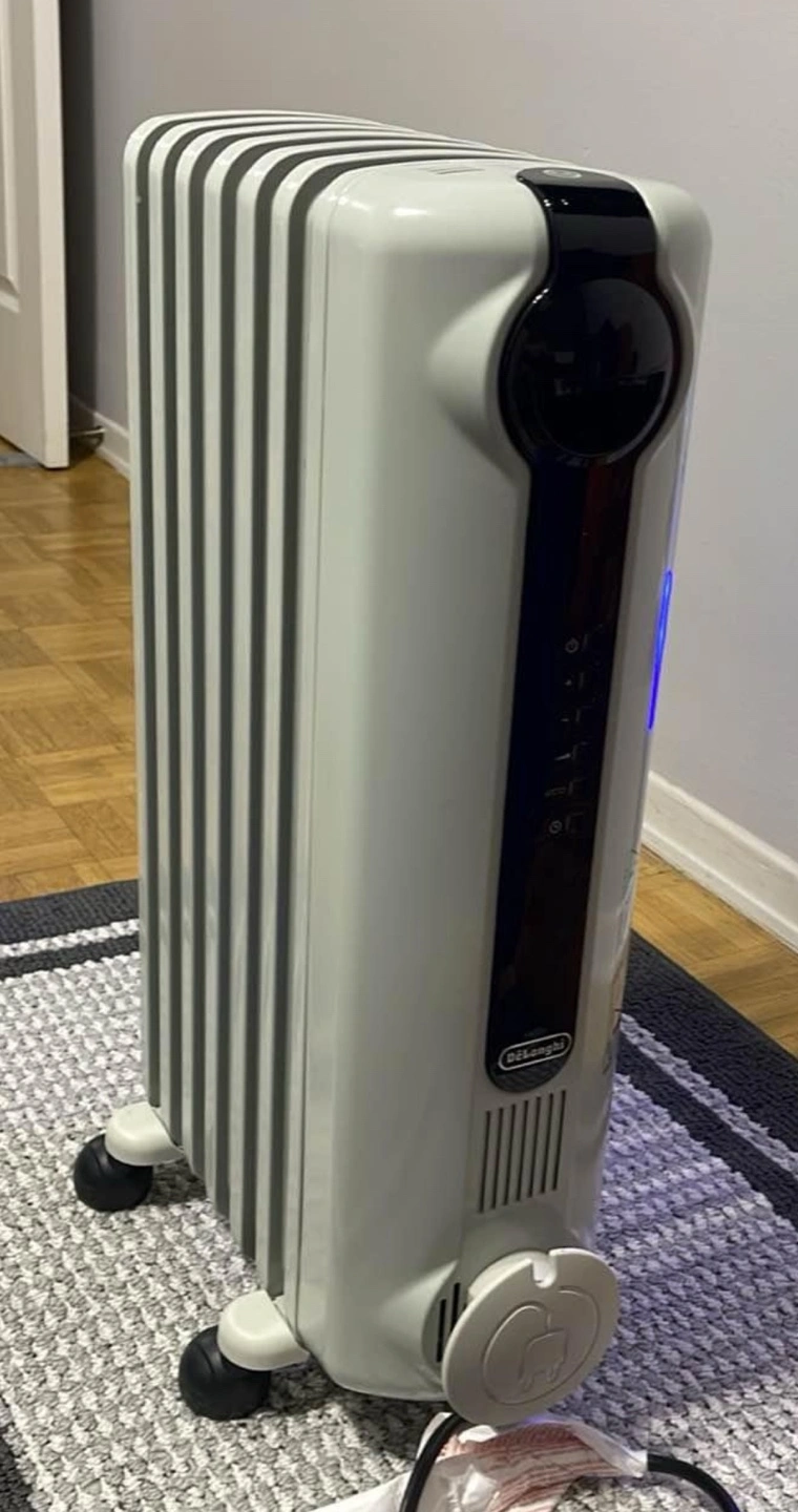Oil filled radiator heater with wheels and digital thermostat. Has multiple heat settings and an eco mode.
