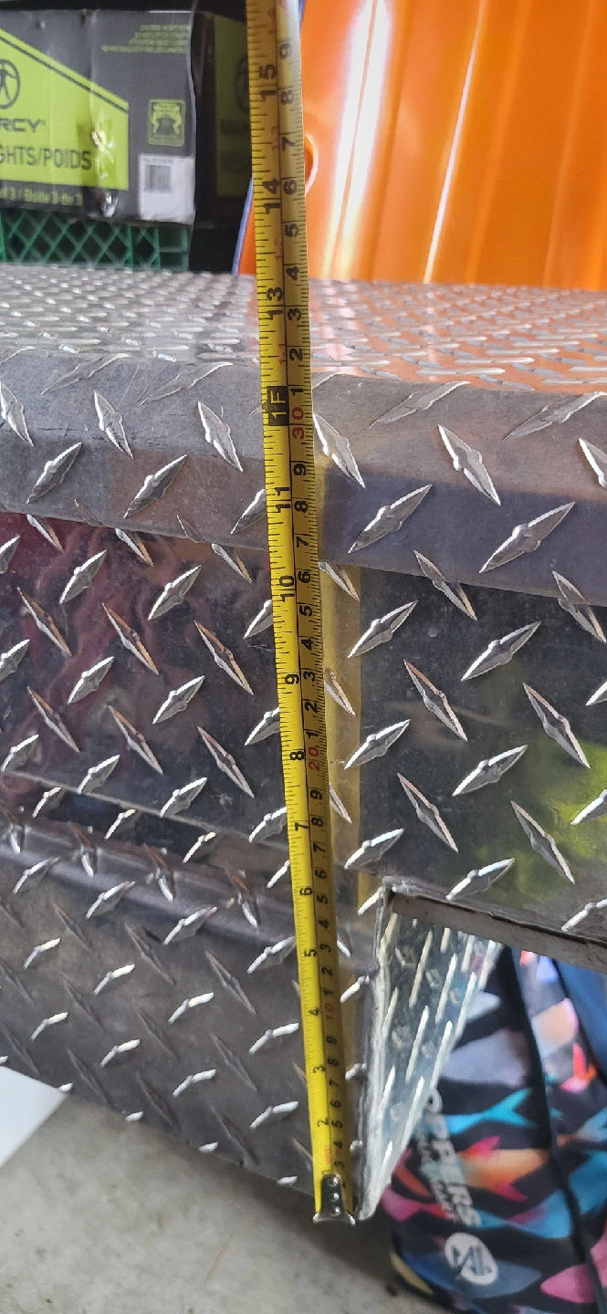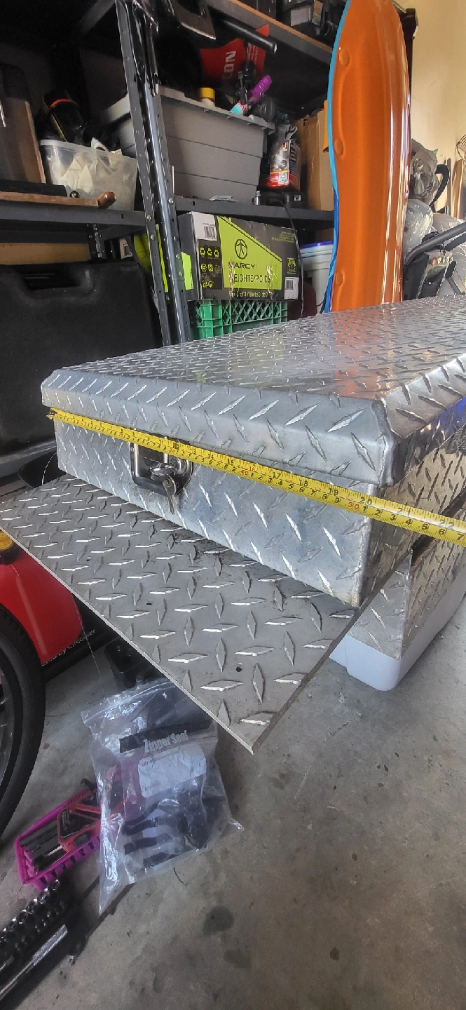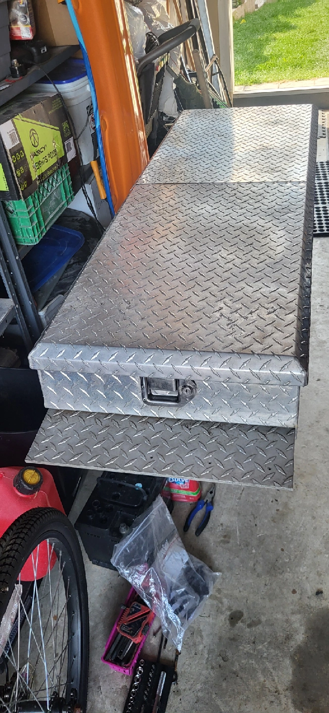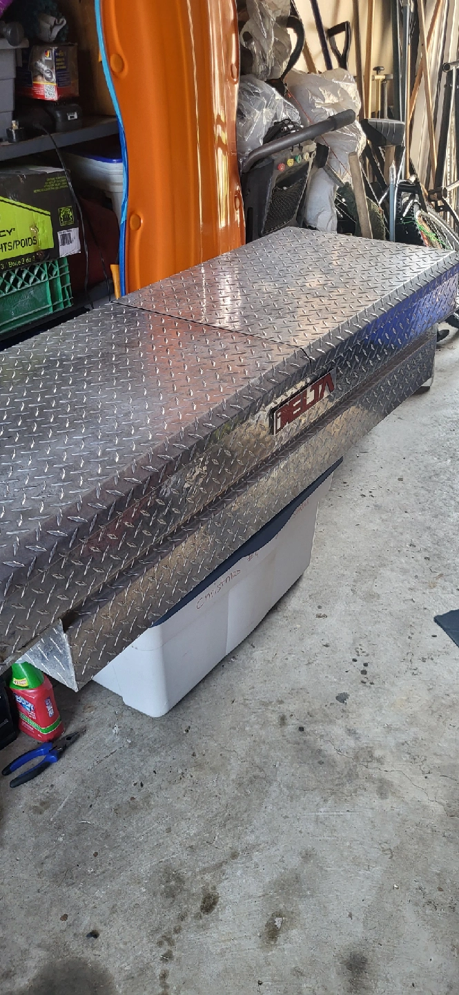 Selling a Delta aluminum truck bed tool box. It's in good condition and measures approximately 68 inches in length. Perfect for keeping your tools secure and organized in your truck bed!