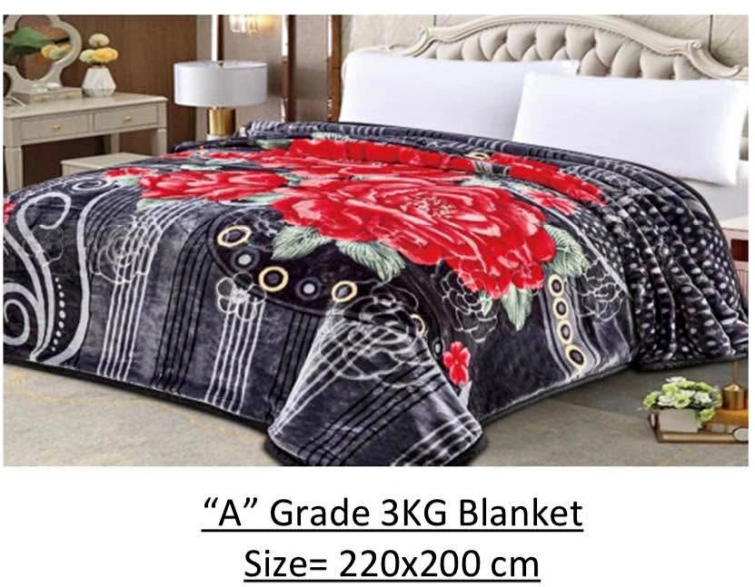 This is a soft and warm 'A' Grade blanket weighing 3 kilograms. It is beautifully designed in attractive and varied colors. The blanket measures 220x200 cm, making it highly suitable for keeping warm on cold winter nights.