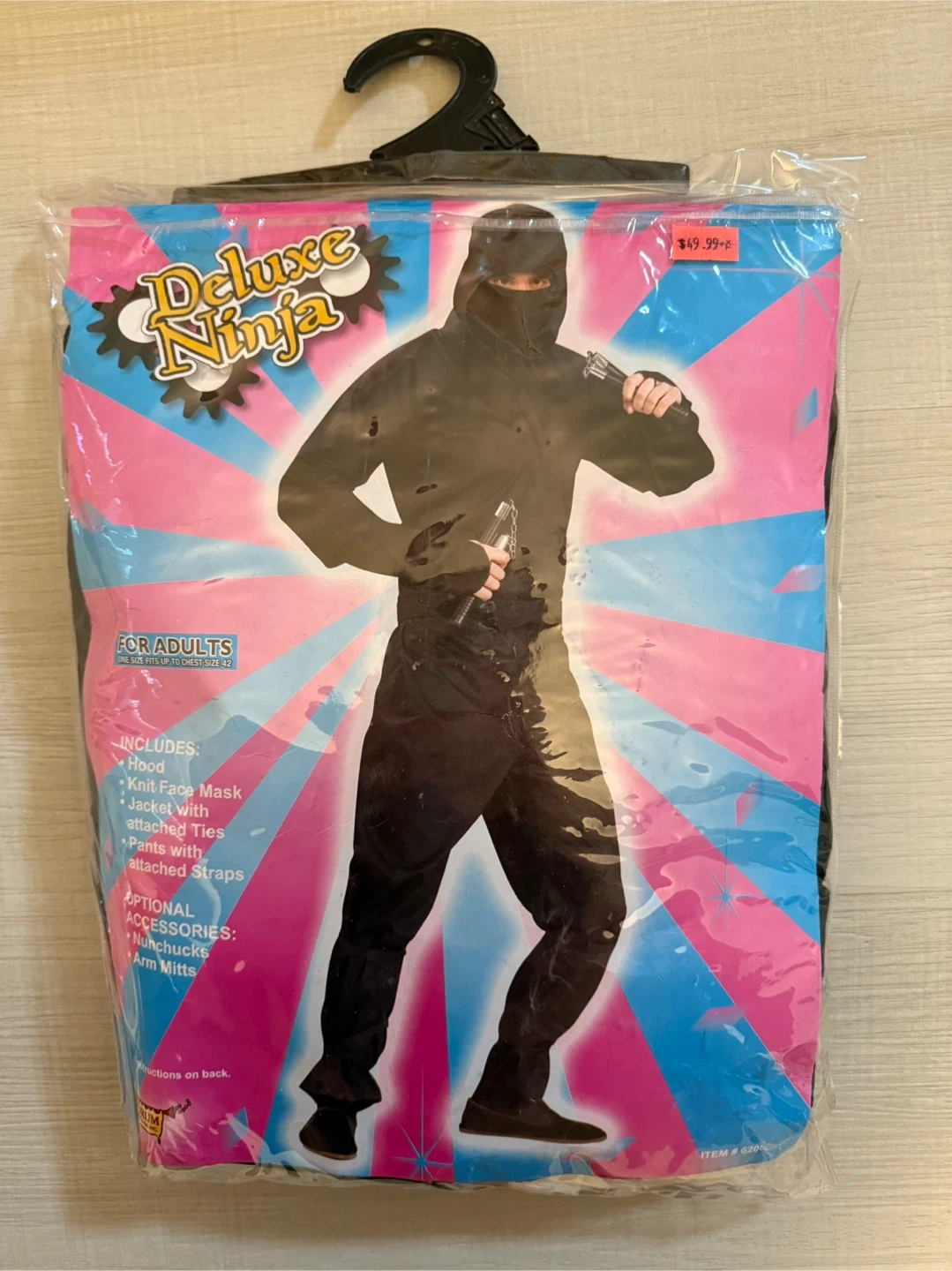 Get ready to sneak around with this Deluxe Ninja costume! It includes the hood, knit face mask, jacket with attached ties, pants with attached straps. Optional accessories include nunchucks and arm mitts. Not intended for use in play by children under 14 years of age
